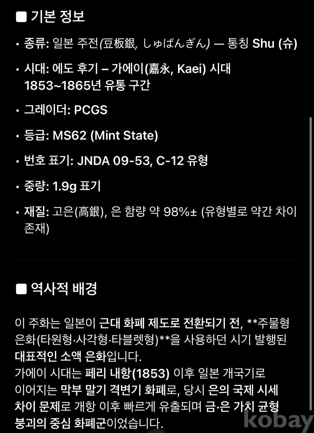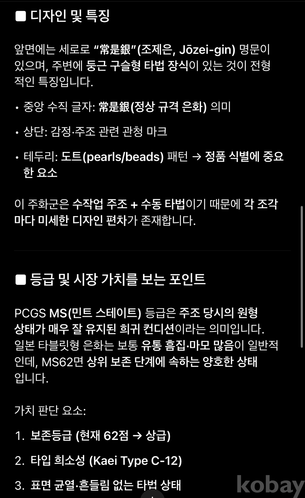 | 물품 크기 | PCGS |