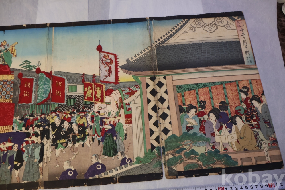 일본 목판화 원본 3 세트 임니다 세월의 흔적을 가진 고미술 목판화 이며 발행 년도와 화가의 낙관을 가진 극히 귀한 소제를 가진 명품 임니다 화가는 치가노부 [조선 통신사가 보이는 목판화 3 세트 명치 22 1889 뒤에는 배접 종이가 보임니다