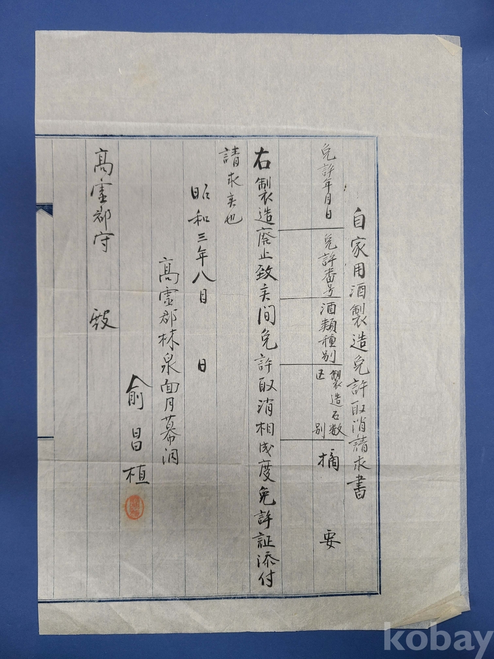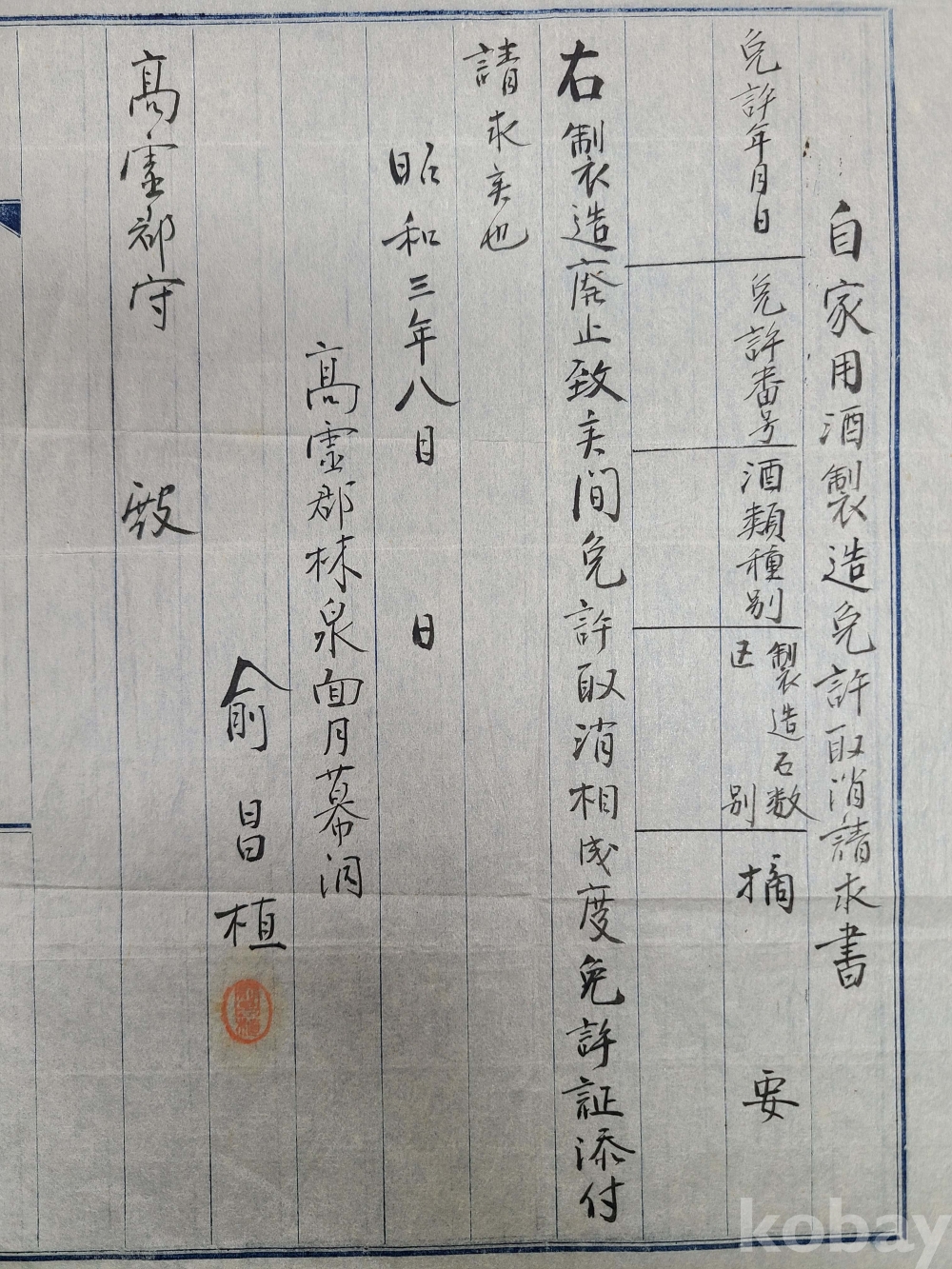 [술자료] 1928년 自家用酒製造免許取消請求書(고령군)