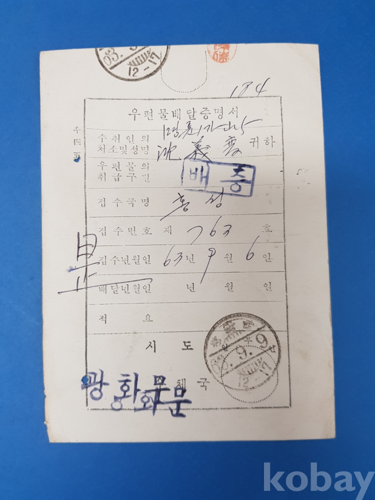 **** 1963년 통신사무엽서 실체/*우편물배달증명서* 광화문,63.9.9