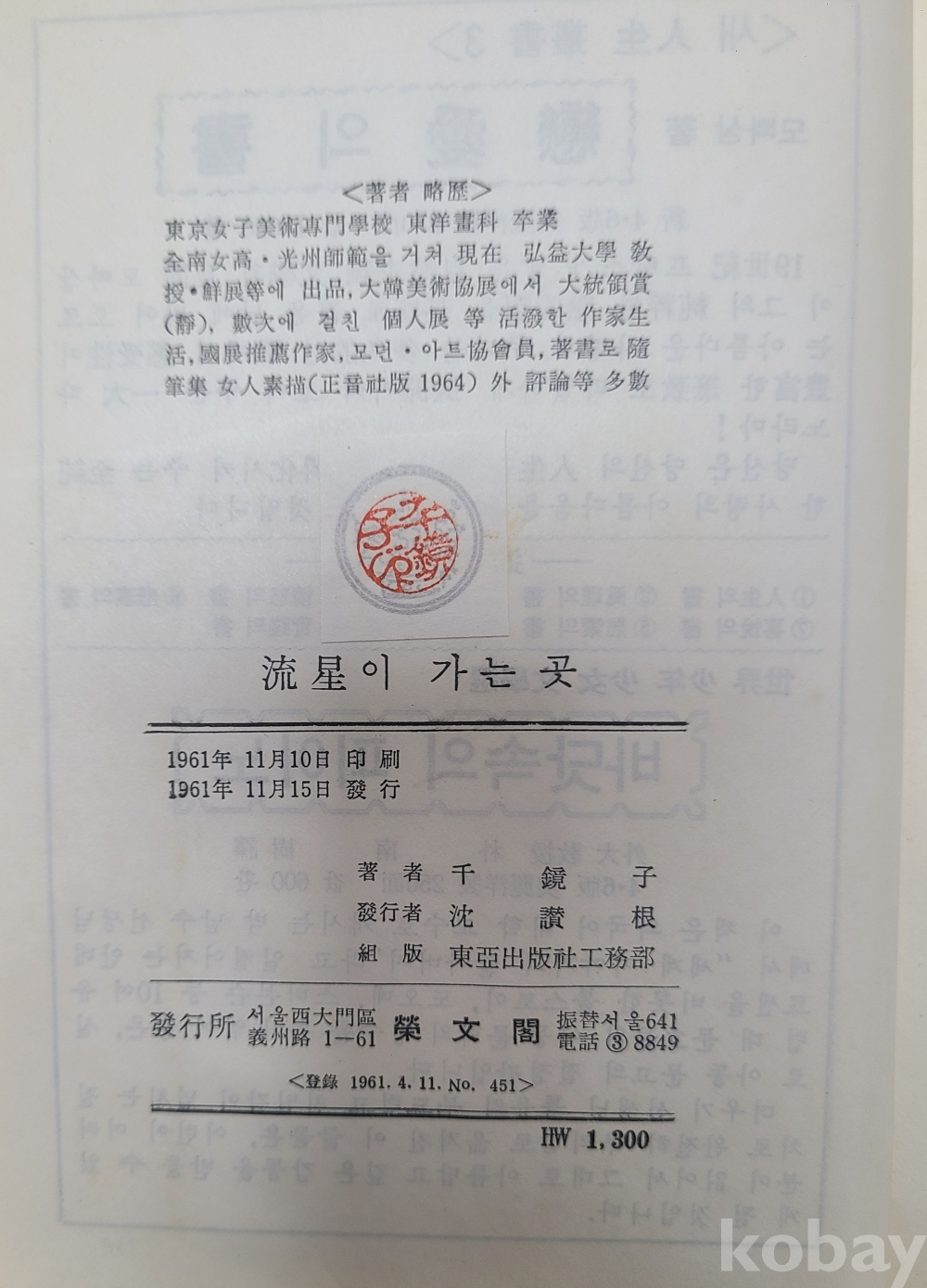 천경자 제2수필집 <유성이 가는 곳> 친필 서명본