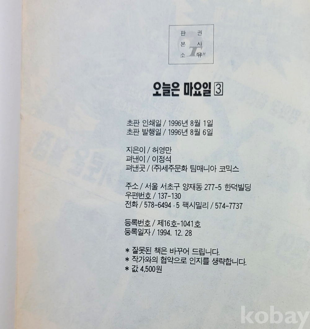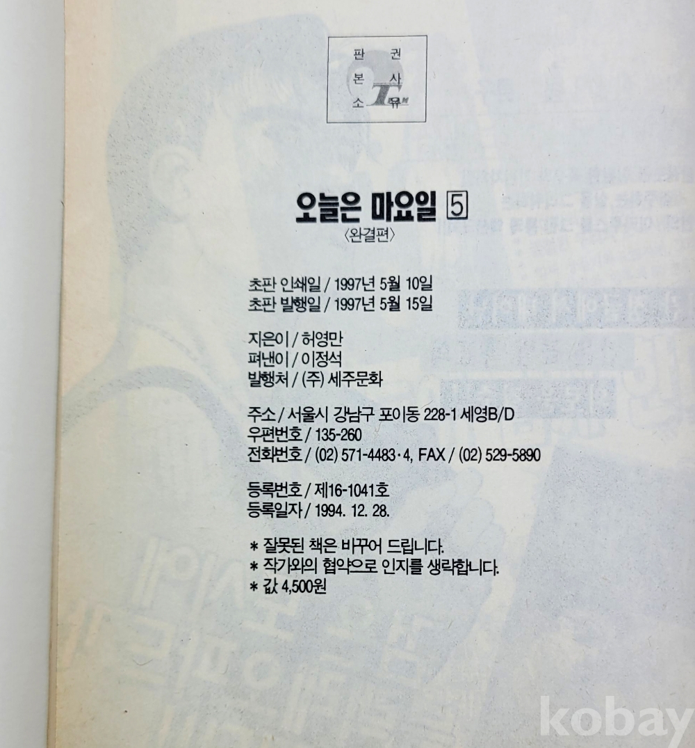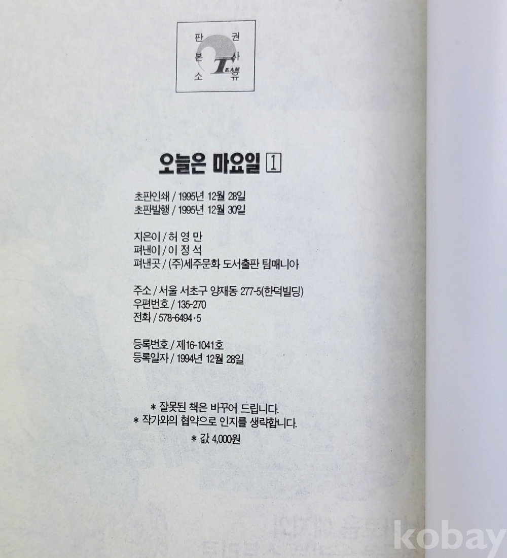 물 품 명 | [팀매니아코믹스] 허영만 / 오늘은 마요일 1~5완결 총5권 / 초판본 / 세화문화 |