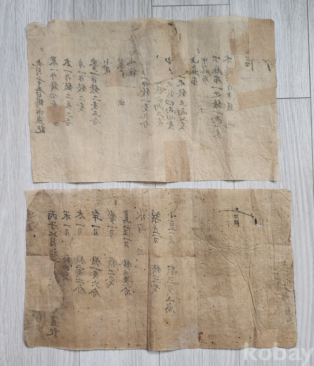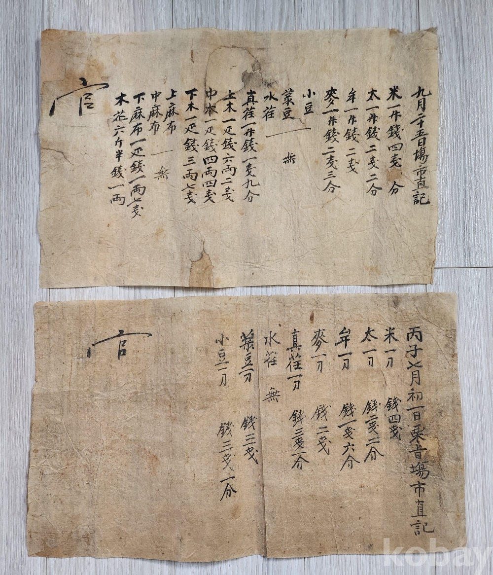 조선시대 병자년 7월에 관에서 발급한 시장 거래물품에 대한 가격 증명서 2점 경남 합천군 율지시장에서 보리 쌀 콩등 시장 거래물품에대한 가격 증명서 2점 입니다 마지막 관수결과 희미하게 관도장이 찍혀 있습니다 뒤면 배접흔적 있으나 상태 양호한 편입니다 사진 참조바랍니다