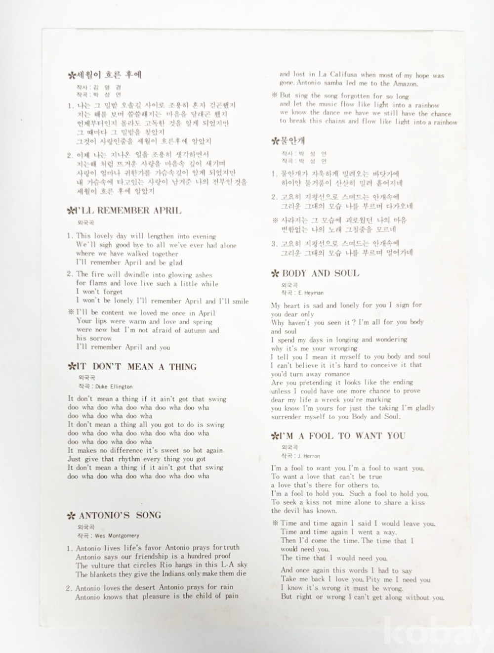 상품 설명 | Side A 1. 세월이 흐른후에 2. 밀양아리랑 3. I'LL REMEMBER APRIL 4. IT DON'T MEAN A THING 5. FRIED PIE Side B 1. ANTONIO'S SONG 2. 물안개 3. BODY & SOUL 4. I'M A FOOL TO WANT YOU 5. SASSY'S BLUES 6. IT'S ALRIGHT WITH ME | ||