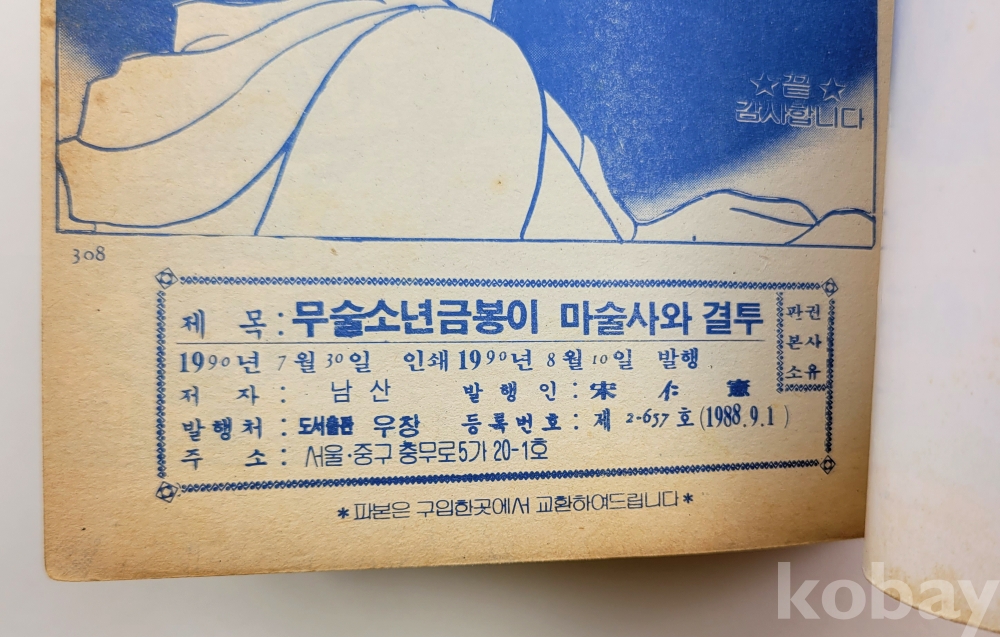 물 품 명 | [스타프로덕션코믹스] 남산 / 무술소년 금봉이 마술사와 결투(대결) / 1990년 초판 / 도서출판 우창 |