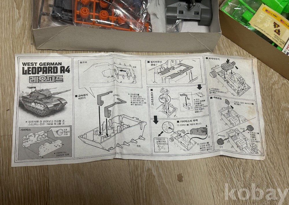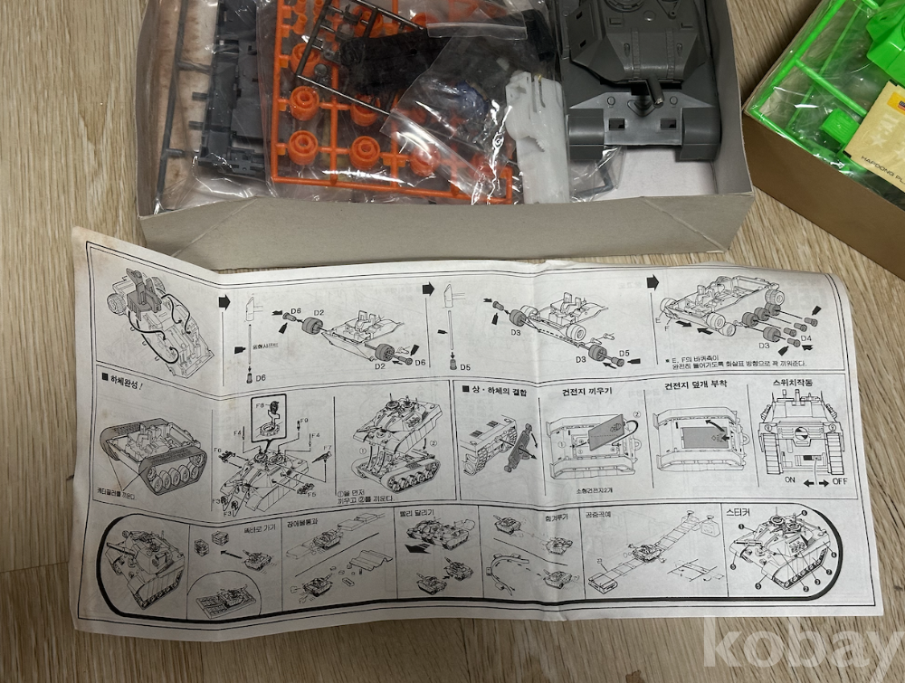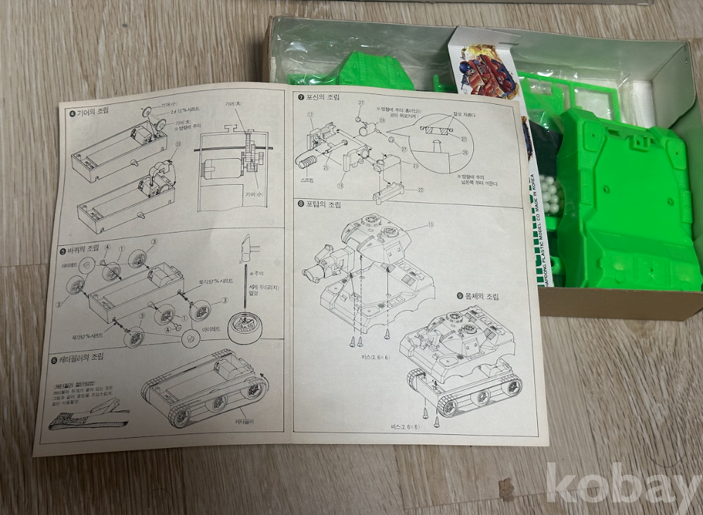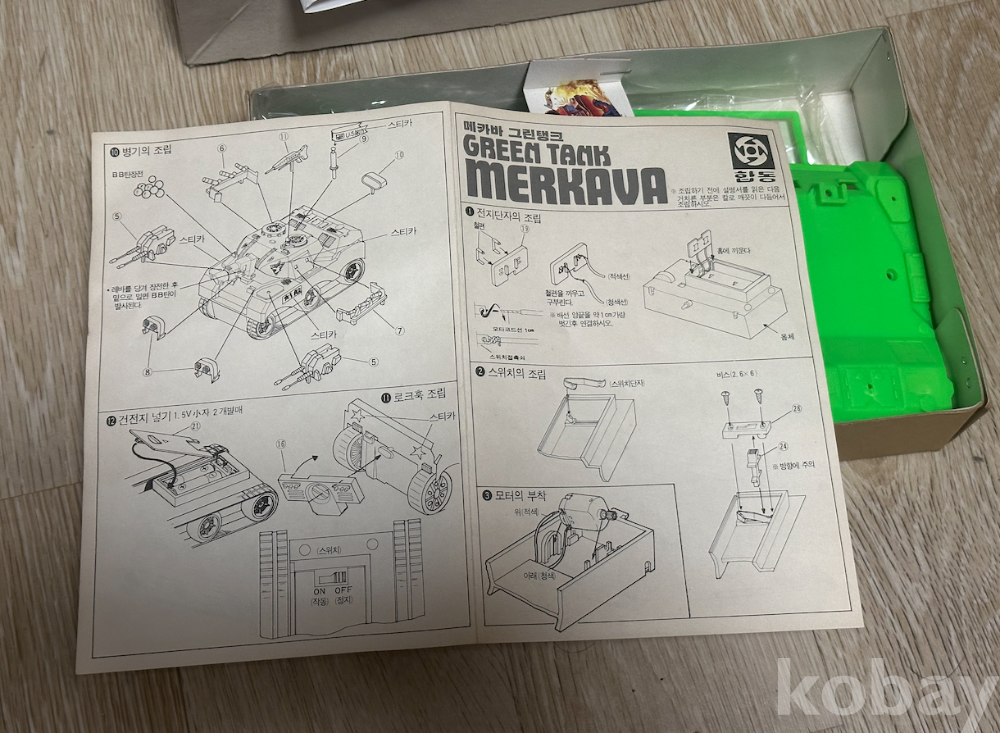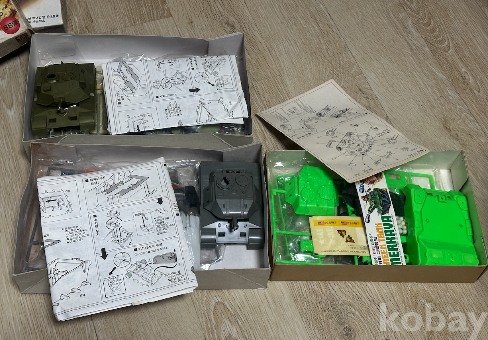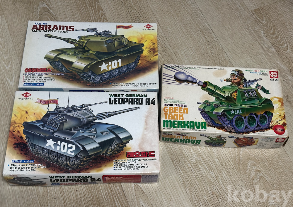 미니카형식의 건전지를 넣어서 앞으로 굴러가는 모터라이즈 장난감입니다. 셋 다 90년대 오래된 제품이라 종이 박스들에 세월의 흔적이 있습니다. 에이브럼스,레오파드는 에디슨과학에서 만든 제품이고 앞으로 굴러가는 작동만 하는 장난감이고 메카바 그린 탱크는 합동과학에서 만든 모터의 힘으로 앞으로 굴러가는 작동과 포신쪽에 동그란 프라스틱을 넣어서 손으로 당기면 발사되는 기믹이 추가된 제품입니다. (레어 제품) 사진에 조립 설명서를 전부다 찍어서 올렸으니 자세히 보시고 구매하시길 바랍니다 ㅎ