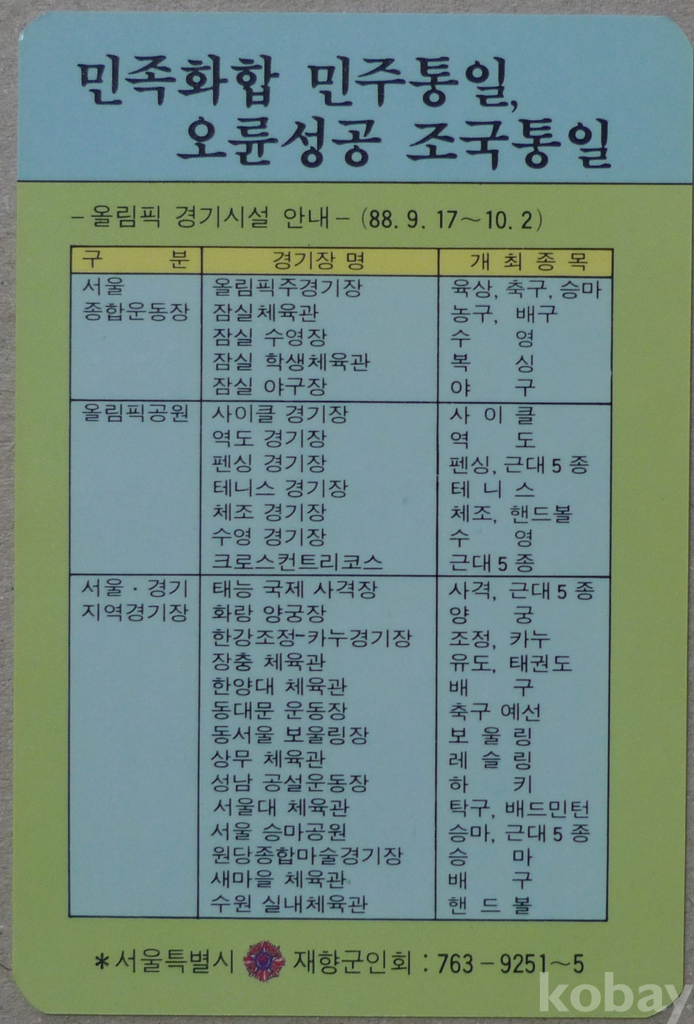 1988년 서울올림픽 경기 시설 안내 포켓 카드
