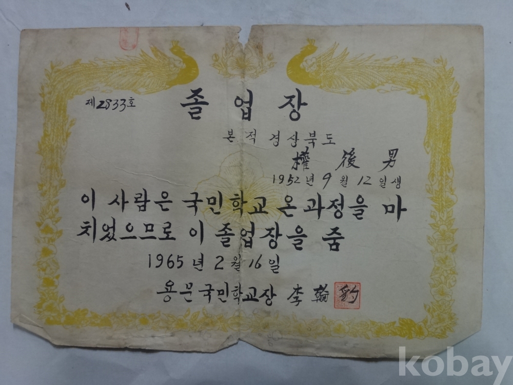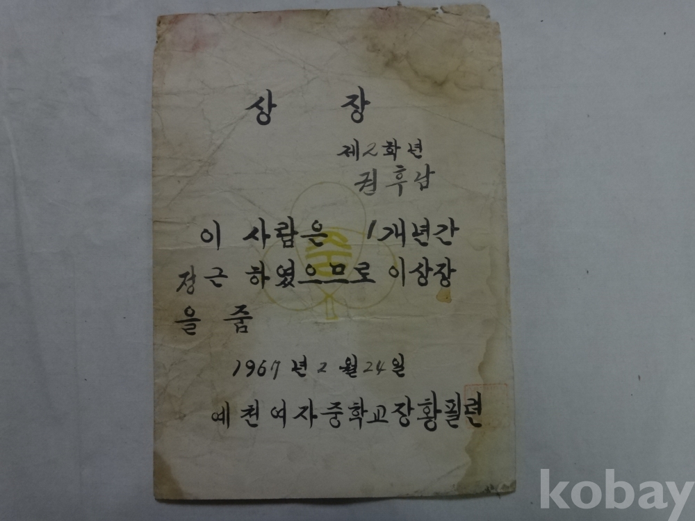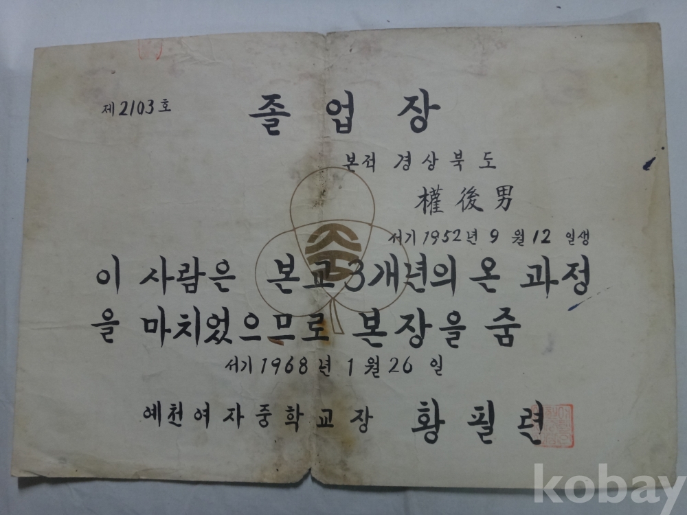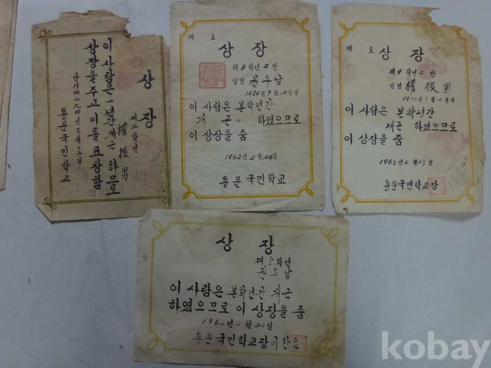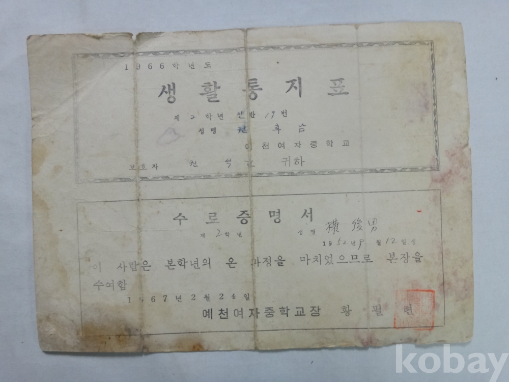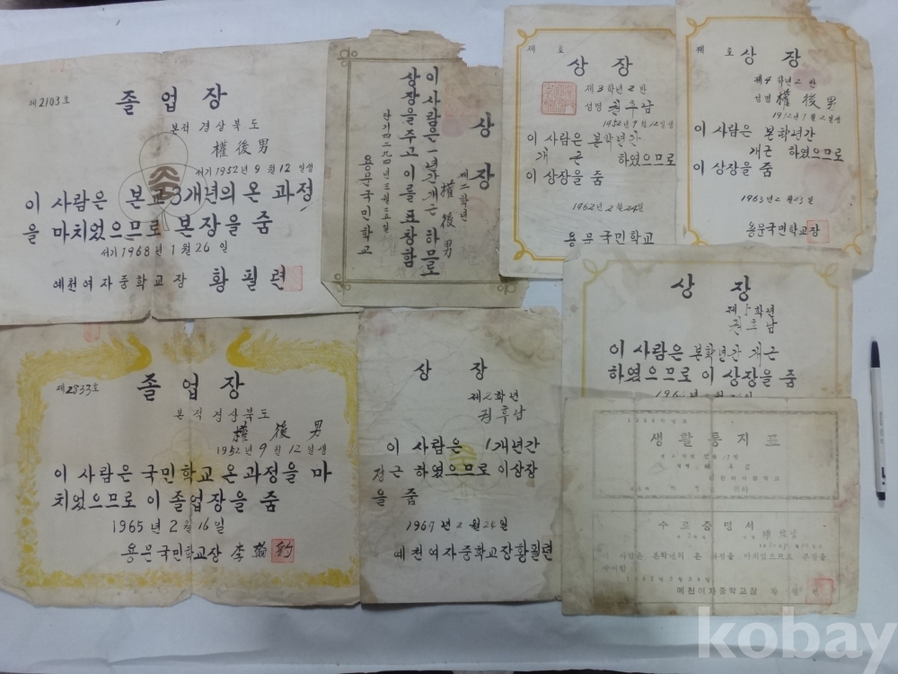 용문국민학교, 예천여자중학교 졸업장, 개근상장, 생활통지표 - 권후남, 8매 일괄 (1965년~)