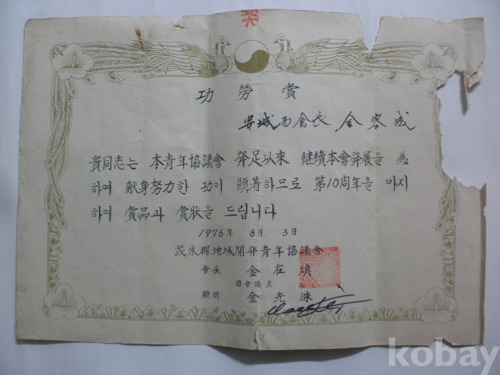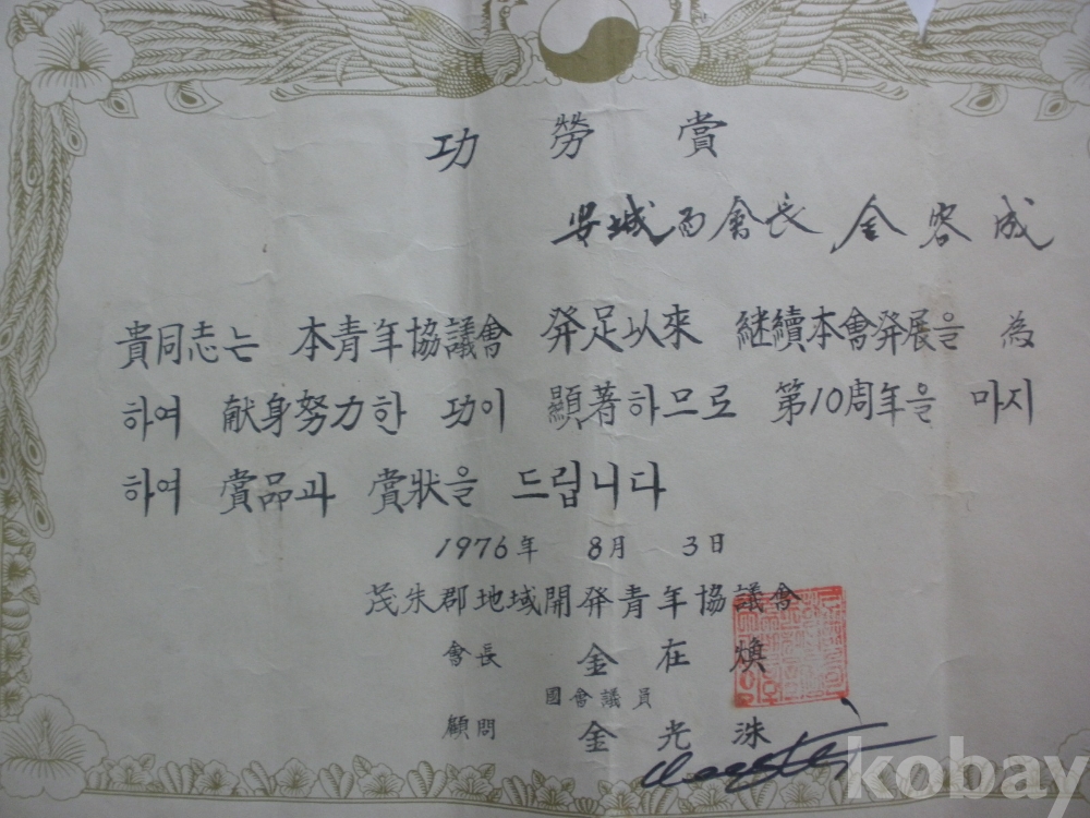 공로상 - 무주군 지역개발청년협의회 안성면 회장 (1976년)