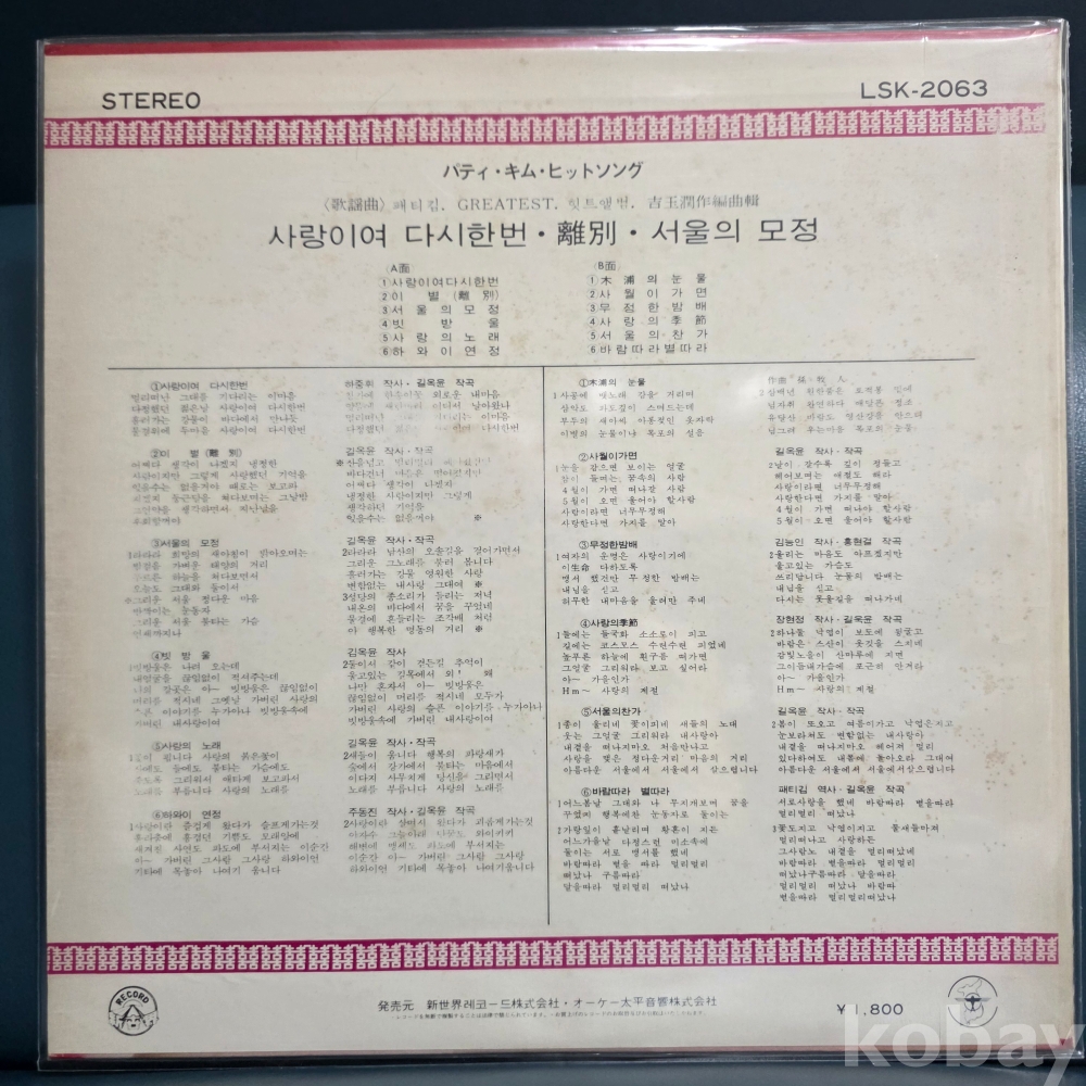패티김(길옥윤 작편곡집) - Greatest Hit Album(사랑이여 다시한번/목포의 눈물)