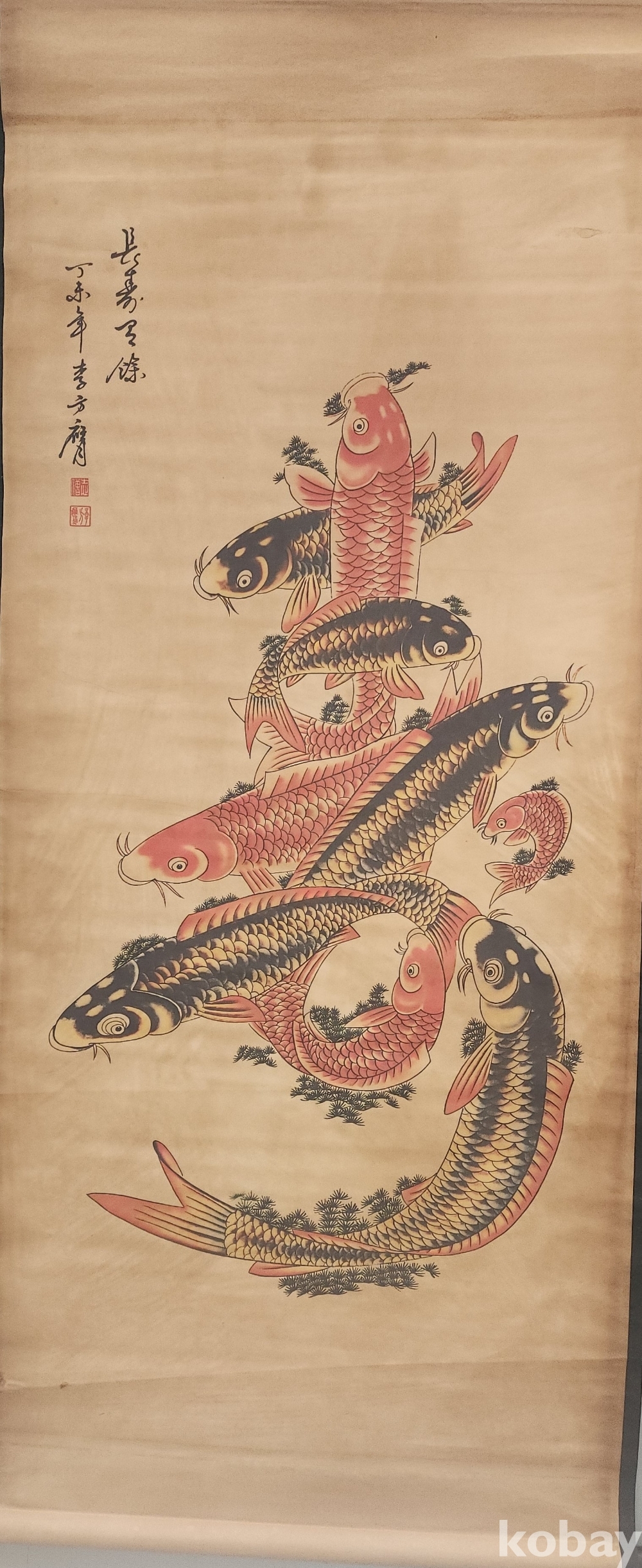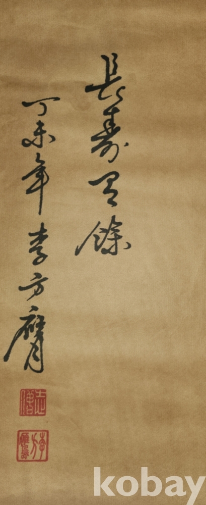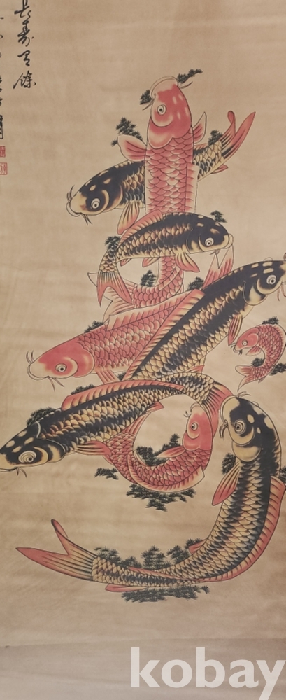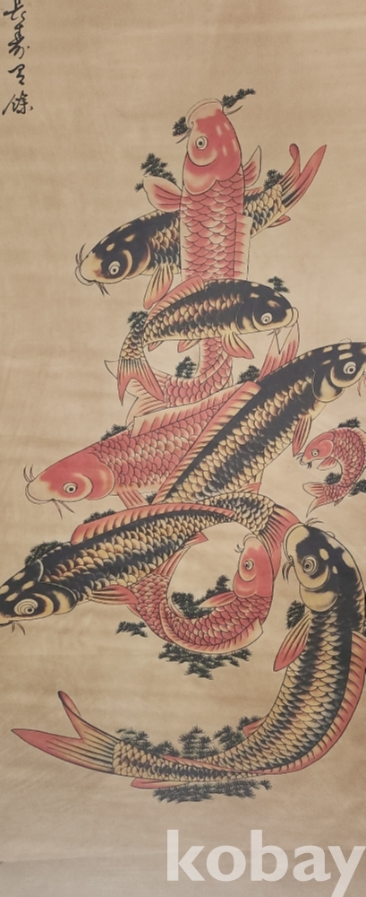 청나라 문인화가 이방응 作 비단에 채색한 비단 잉어로 수(壽) 문자도 족자입니다,