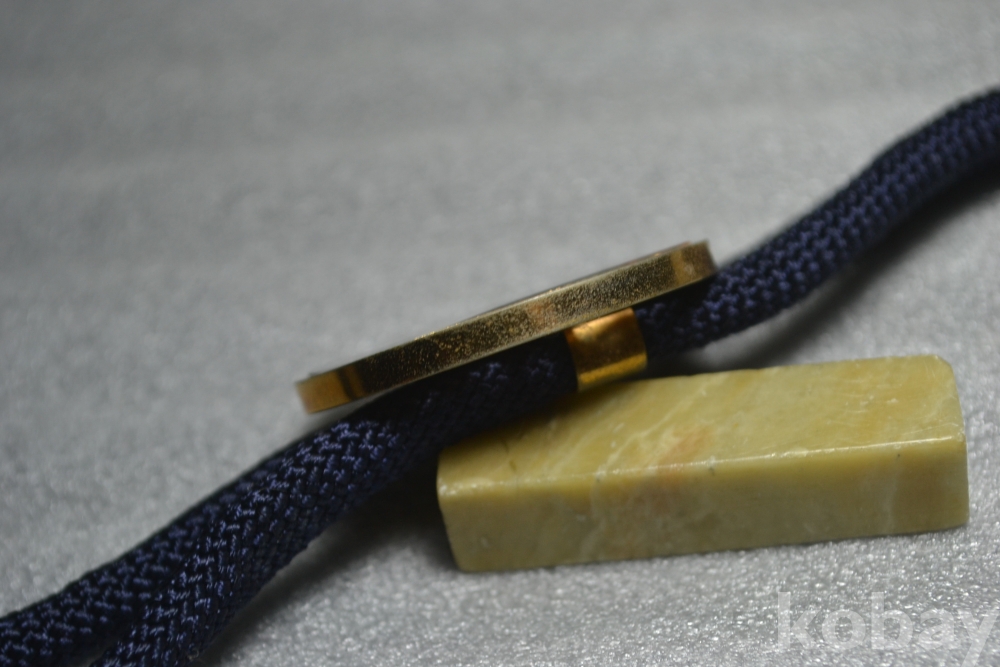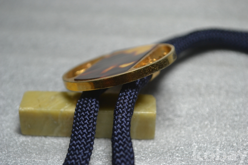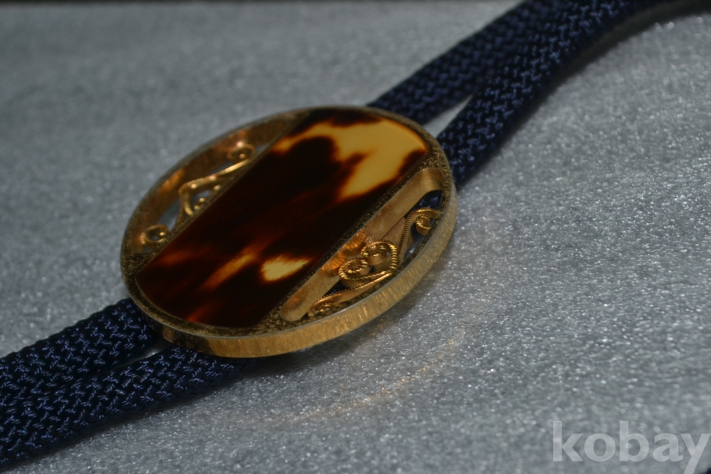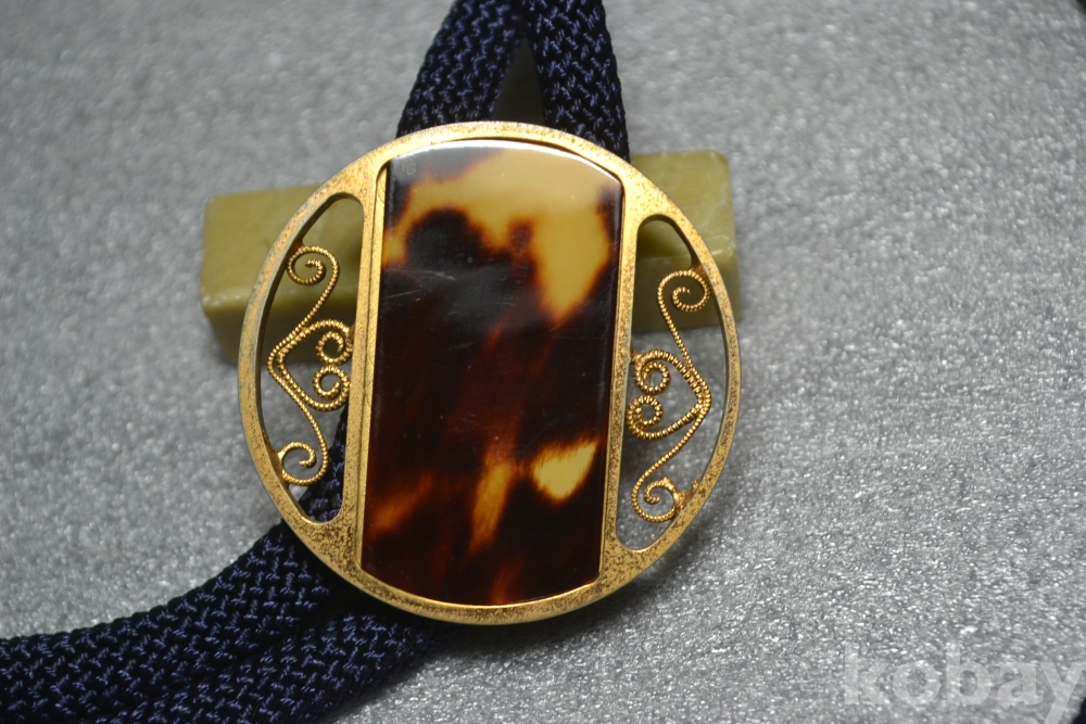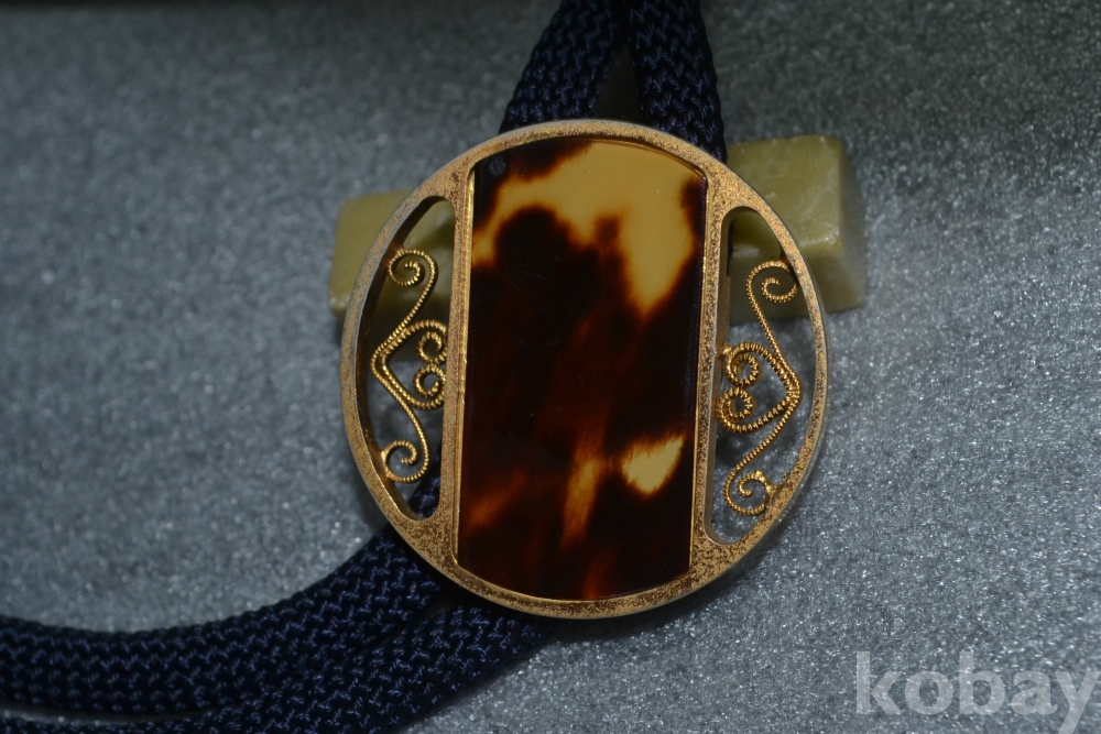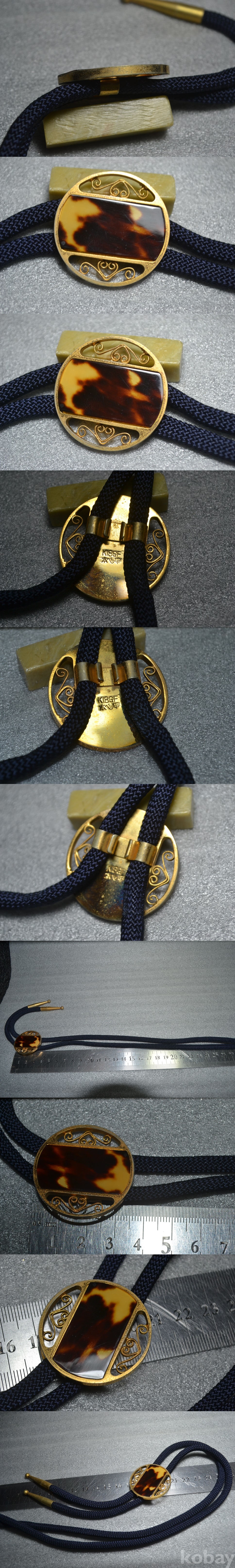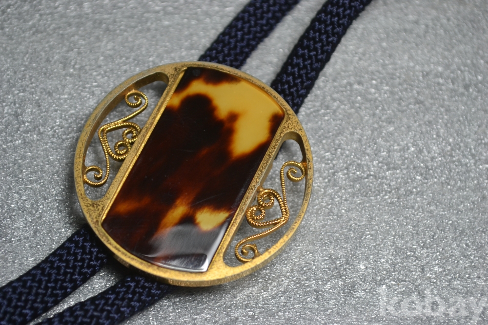 " 진품 대모보석 ".. 진품 대모(진품 별갑(귀갑)(本べっ甲) 각인표기)( K18GF(금도금 각인표기).. " 납작한 형태의 진한 얼룩무늬 진품대모 장식알 디자인~ 지름 3.2 cm X 1.7 cm ~ 아름다운 대모장식 루프타이 목걸이.. 진품 대모갑(귀갑) 대모장식 루프타이 작품