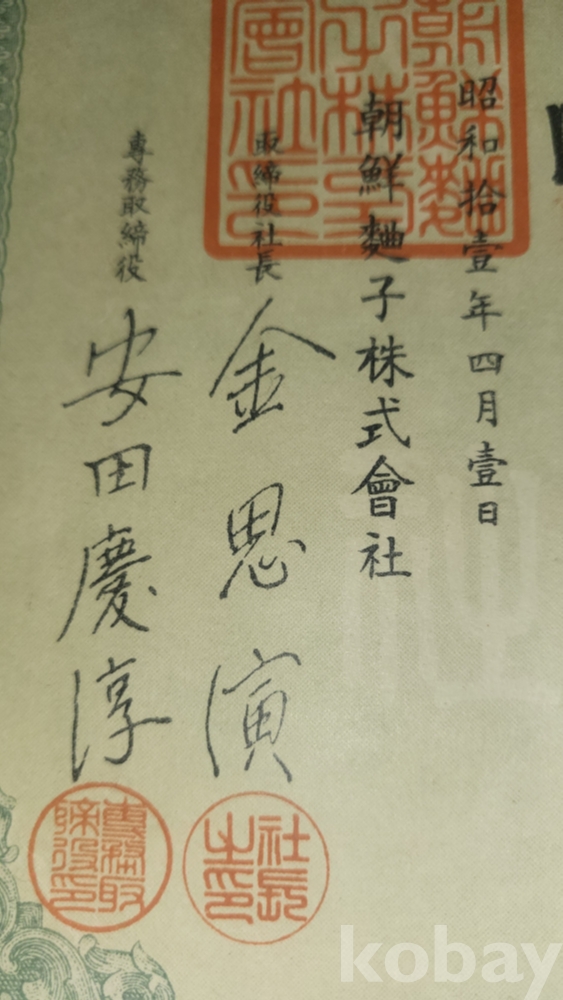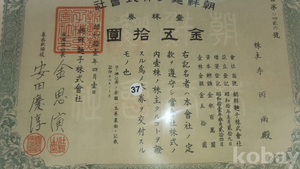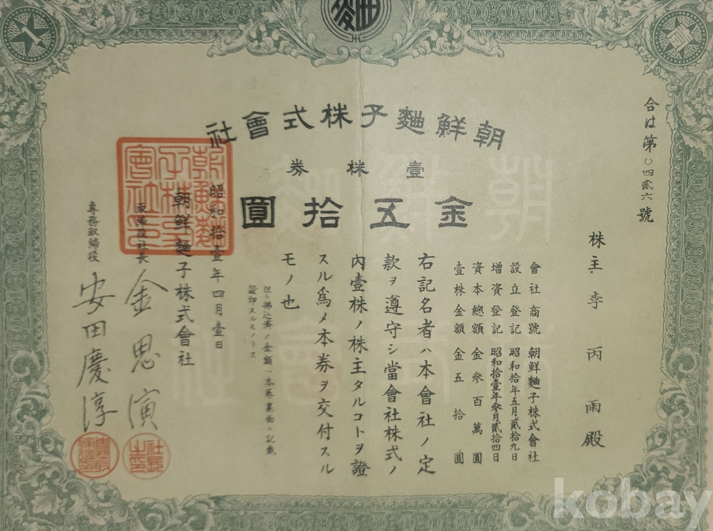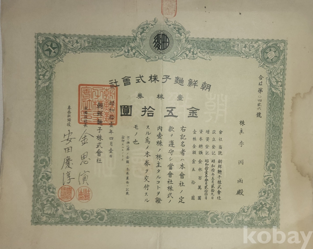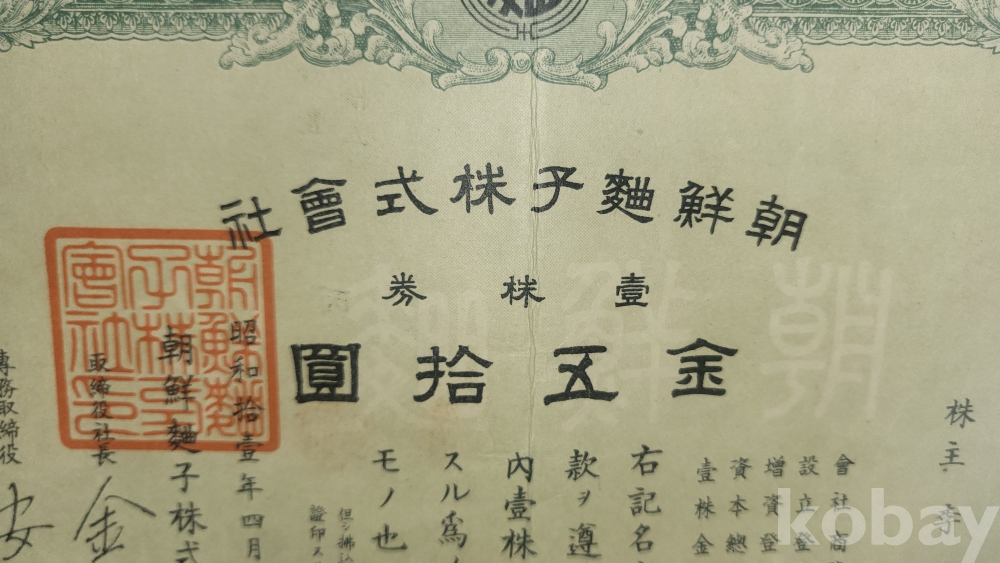 1936년(쇼와11년)조선식산은행 (朝鮮殖産銀行)에서 발행한 주식증서입니다,