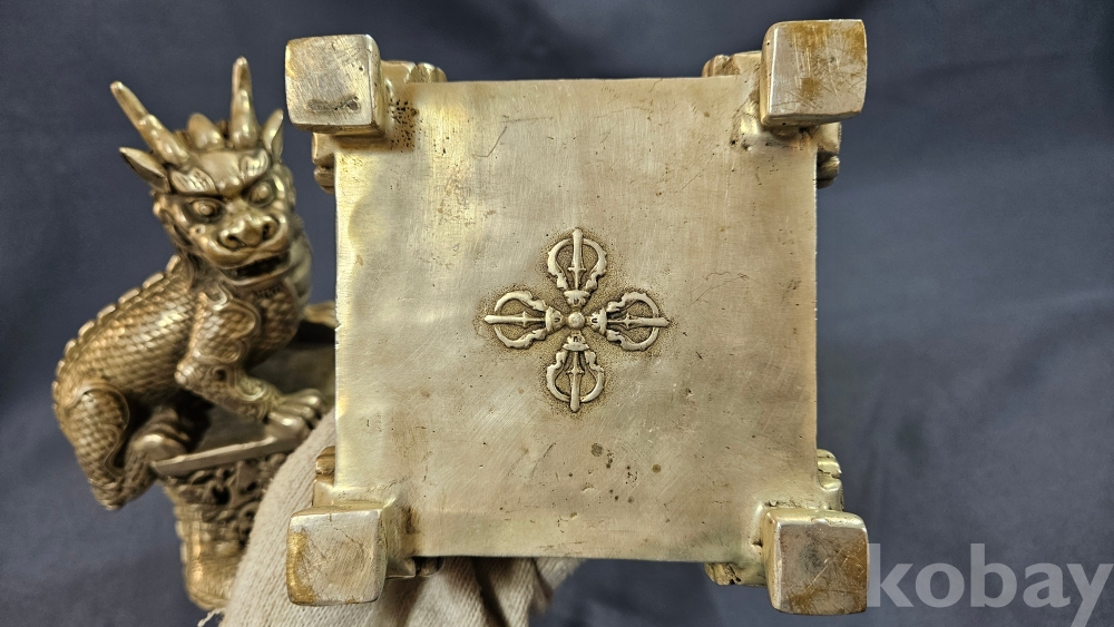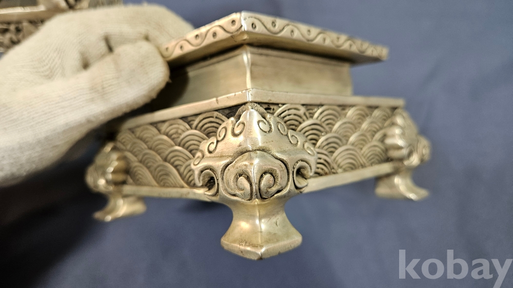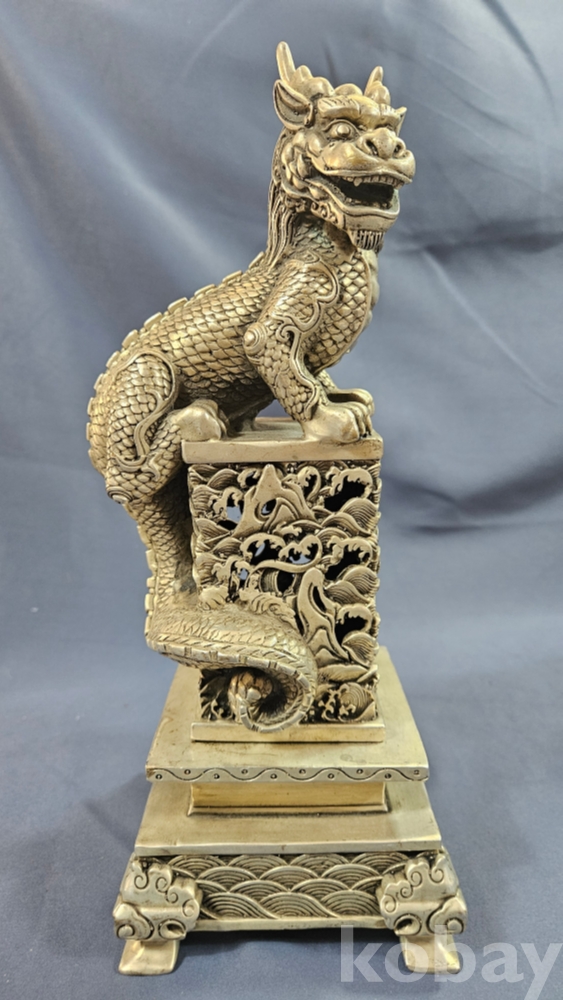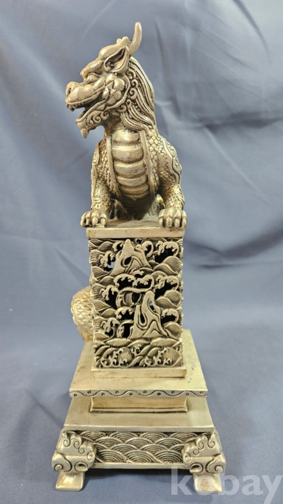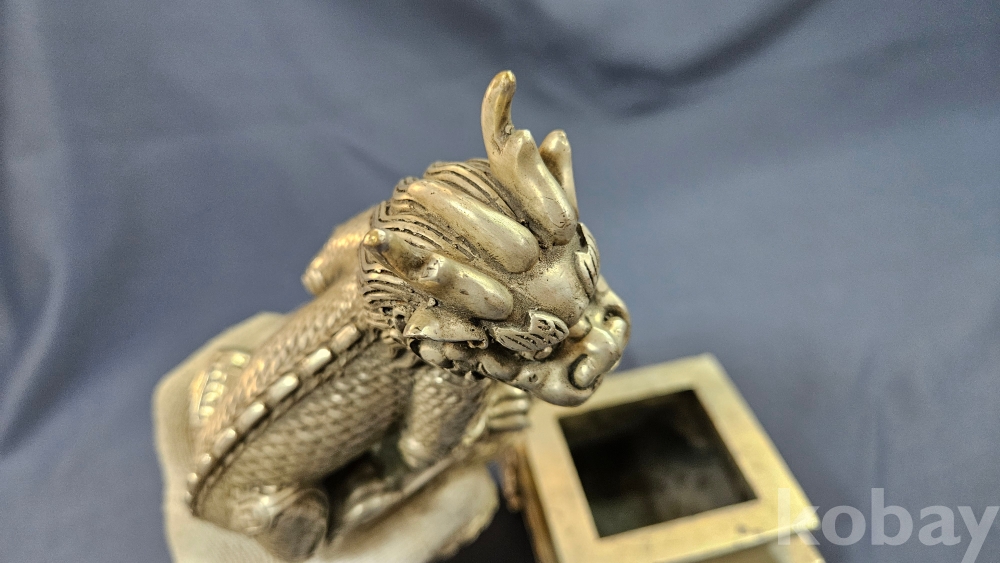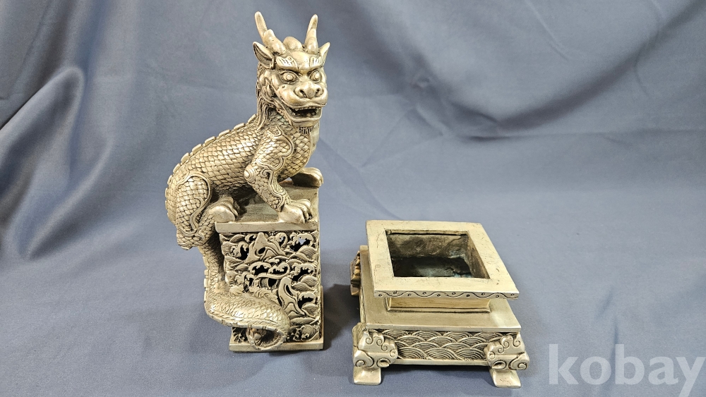 커다란 고대동물이 앉아있는 모습의 큼직한 백동 향로입니다.