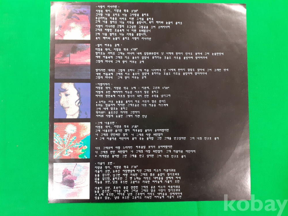 | 자켓상태 | EX : 약간의 마모, 모서리 찢김 존재 | 음반상태 | EX : 재생에 영향 없는 가벼운 기스 존재 | 발매정보 | 알수없음 | 가사지여부 | 유 |