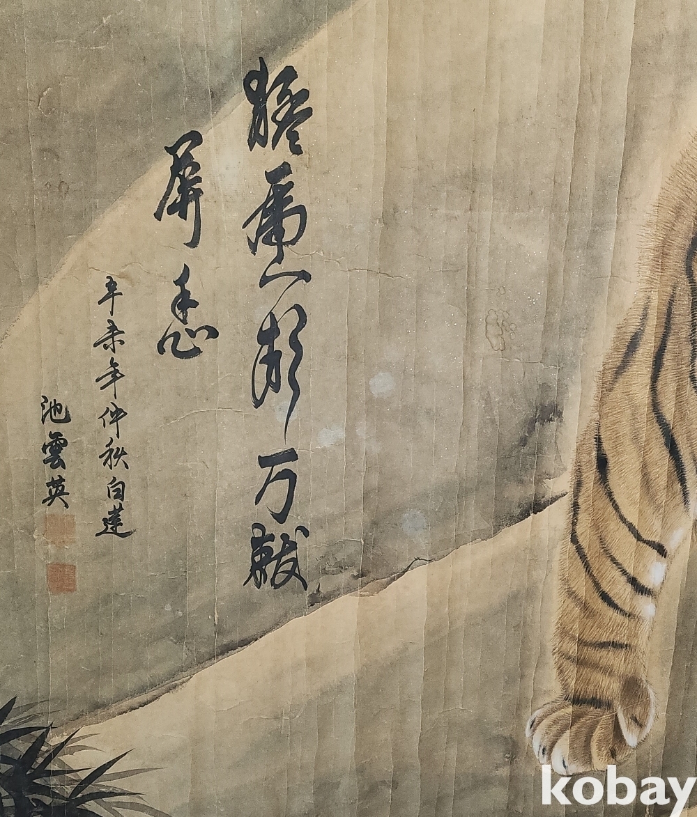 지운영(地雲英) 수결이 보이는 종이에 채색 한 대형급 대나무와 호랑이(竹虎) 그림입니다,