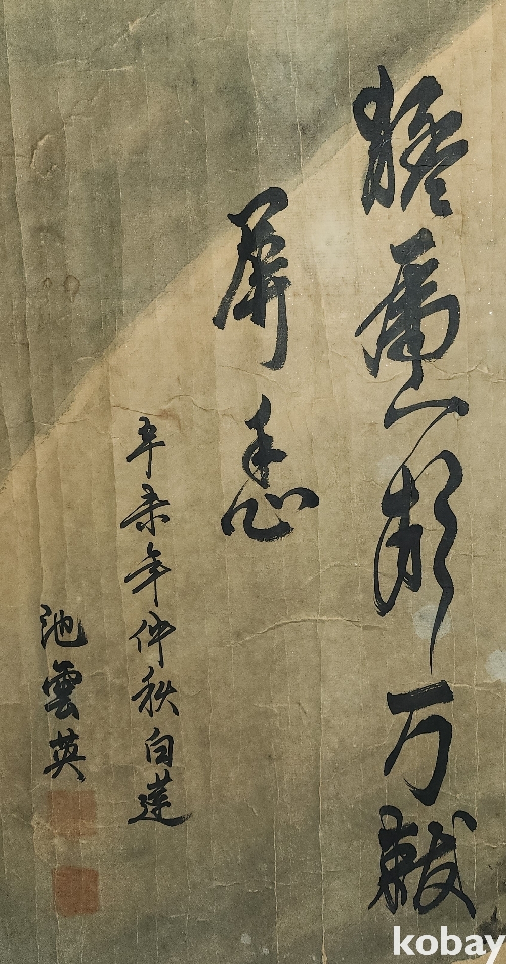 작품의 테두리 비단천에는 얼룩과 찢김이 보임니다,