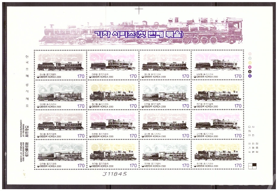 (한국전지) 2000.2.1 기차시리즈(첫번째묶음) sheet of 16 MNH