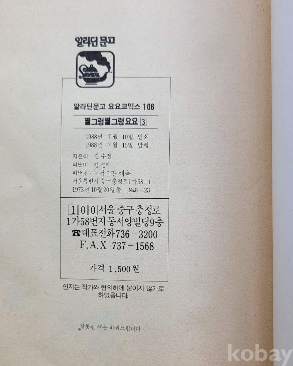 물 품 명 | [요요코믹스] 김수정 / 쩔그렁 쩔그렁! 요요 제3권 / 1988년 초판 / 도서출판 예음 |
