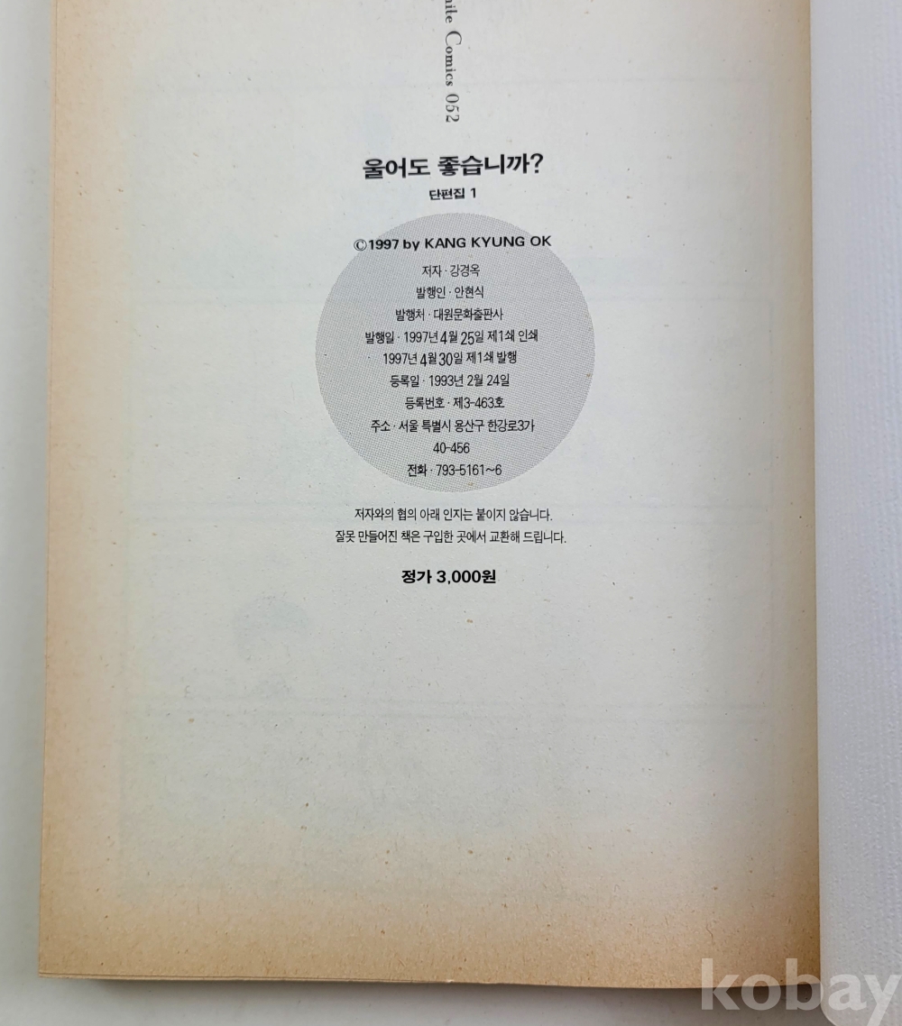 물 품 명 | [화이트코믹스] 강경옥 : 단편집(1) / 울어도 좋습니까 ? / 1997년 초판 / 대원문화출판사 |