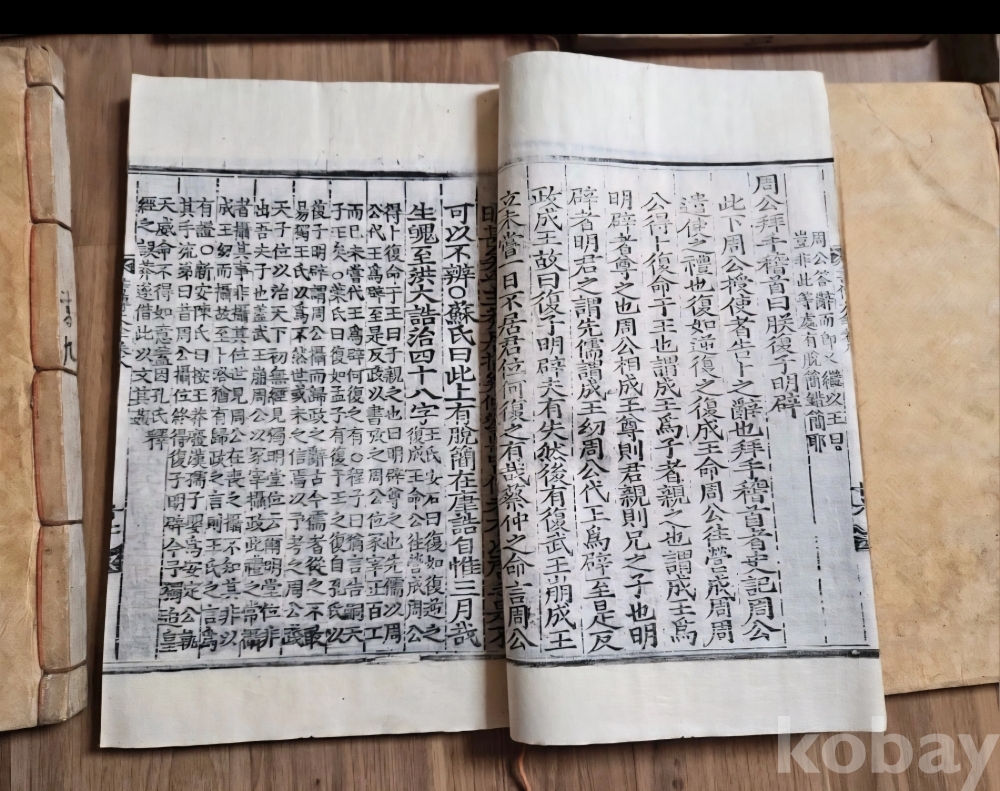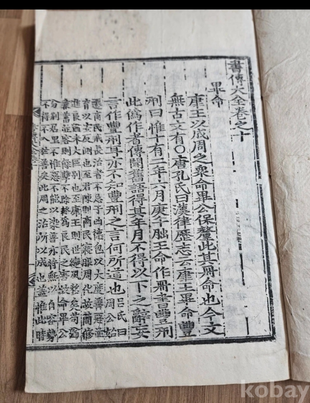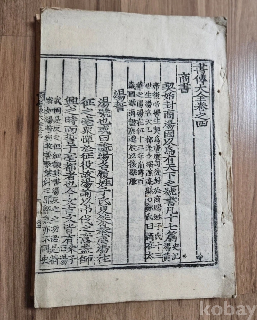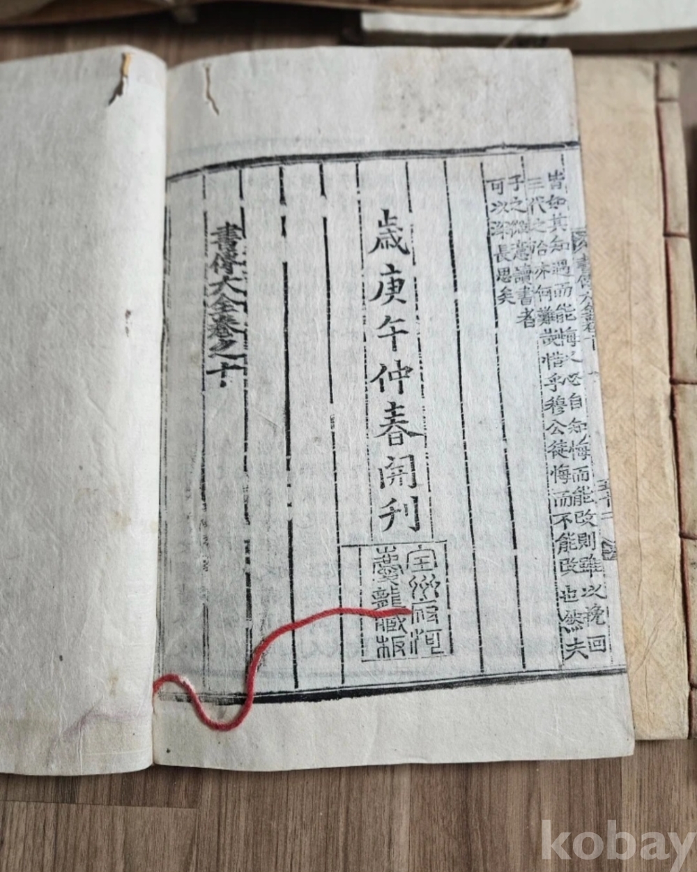 <p>가장 왼쪽에 세로로 크게 보이는 글자는 書傳大全卷之四 (서전대전 권지사)입니다.<p>이는 앞서 확인하신 대로, 『서경(書經)』 해설서인 『서전대전』 제4권을 의미합니다.<p>2. 간행 정보 (판기, 版記)<p>가운데 세로로 쓰인 글자는 이 책이 인쇄된 시기를 나타내는 간행 연도입니다.<p>歲庚午仲春刊 (세경오중춘간):<p>歲庚午 (세경오): 경오년에. 경오년은 60갑자 중 하나로, 조선 시대나 중국에서 여러 해에 해당할 수 있습니다 (예: 1690년, 1750년, 1810년, 1870년 등).<p>仲春 (중춘): 음력 2월을 뜻합니다.<p>刊 (간): **간행(펴냄)**했다는 뜻입니다.조선후기 추정된 목판본으로