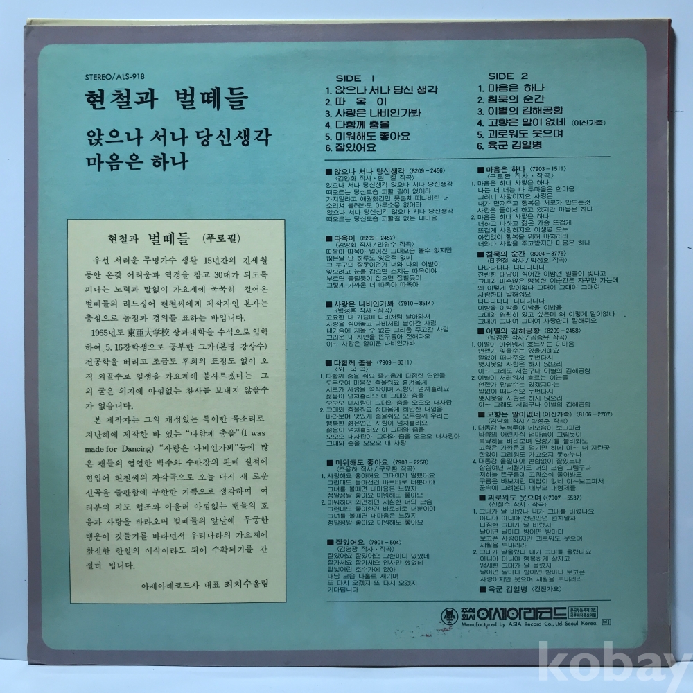 LP 36,450-5 현철과 벌떼들 - 않으나 서나 당신생각 . 82 아세아 자켓 EX+ 알판 EX