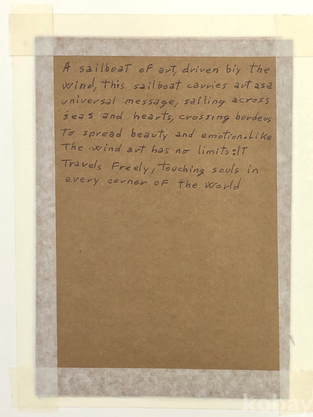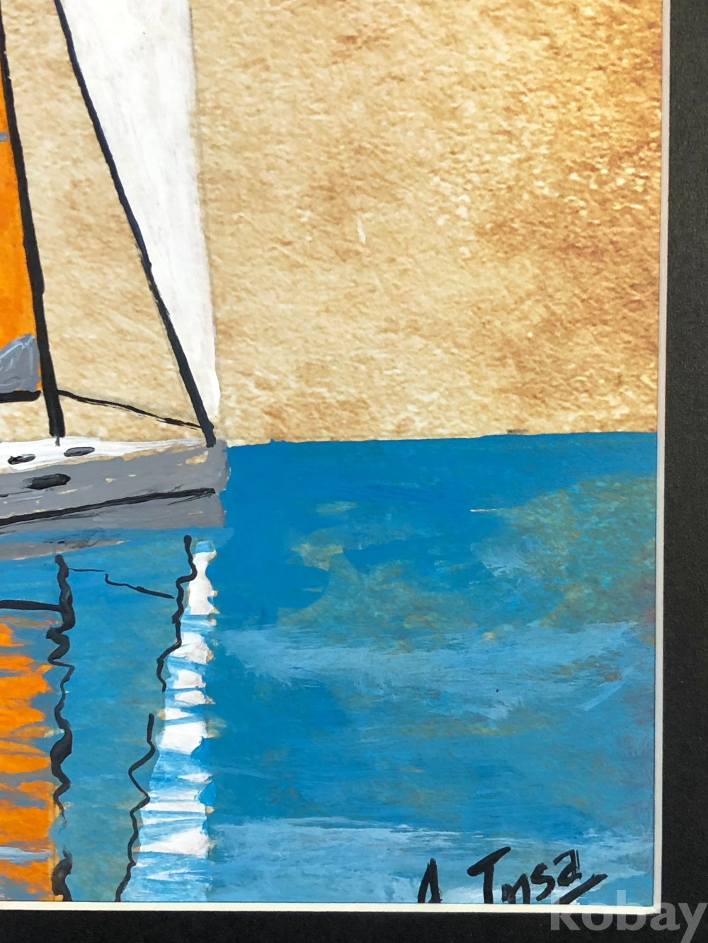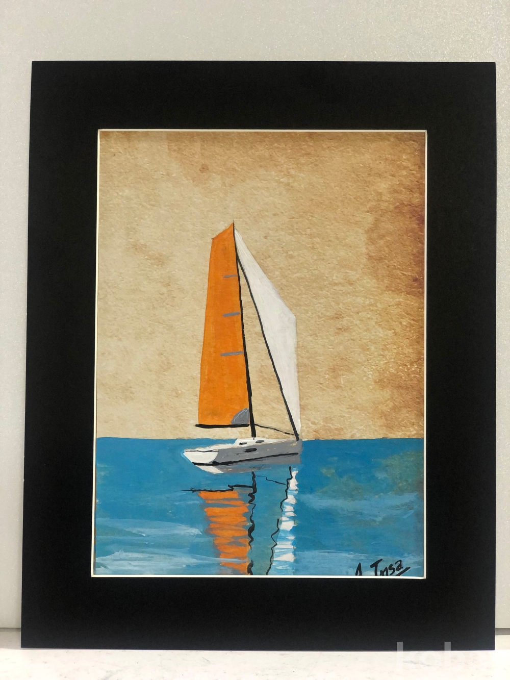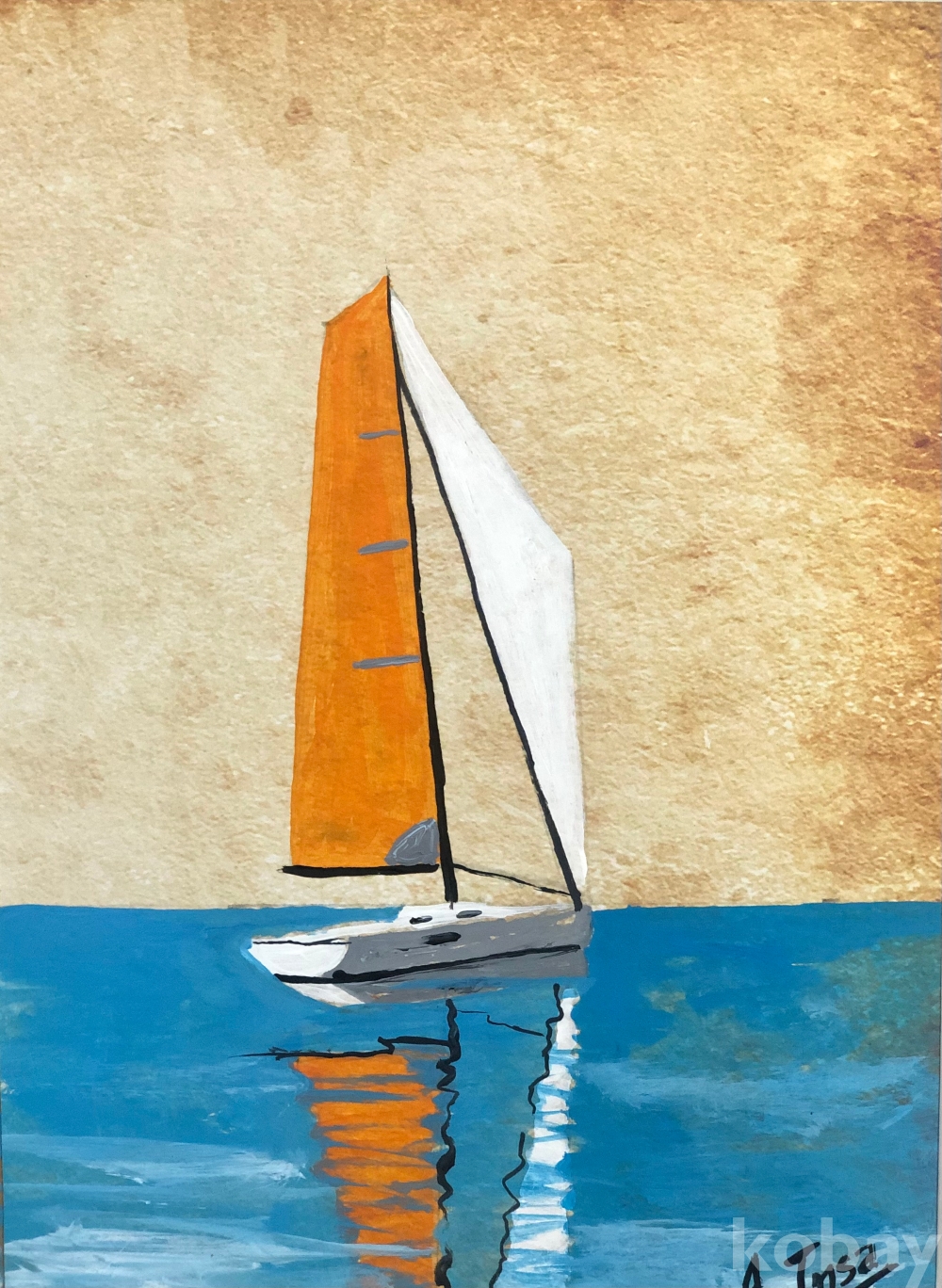 잔잔한 물결 위로 오렌지빛 돛단배가 천천히 미끄러지듯 나아가는 풍경을 담은 작품입니다.