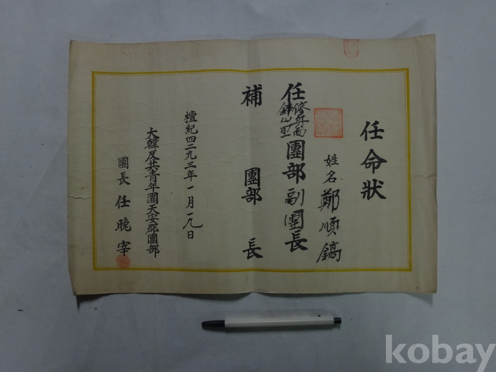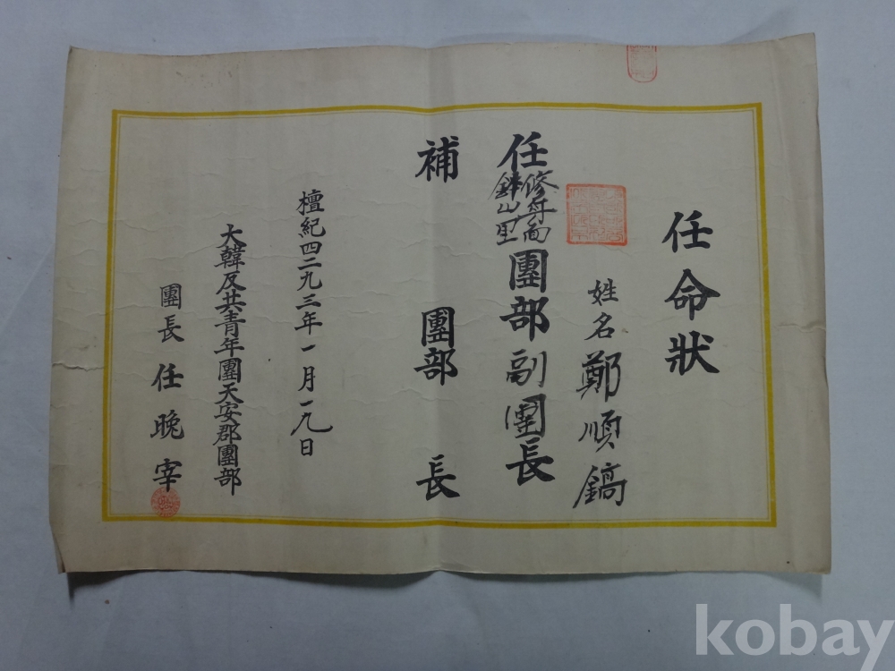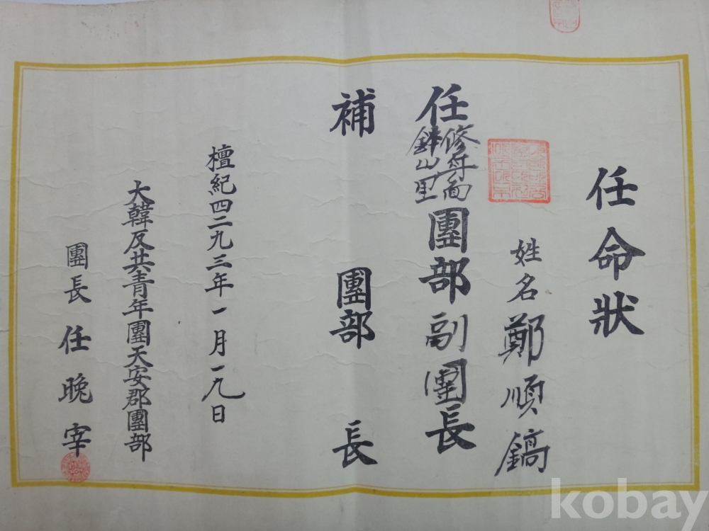대한방공청년단 천안군단부 - 수신면 발산리단부 부단장 임명장 (1960년)