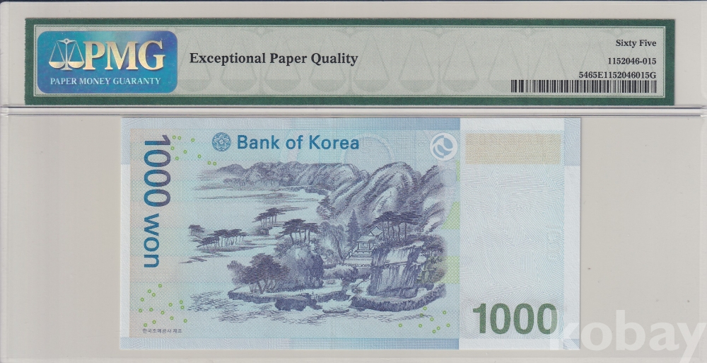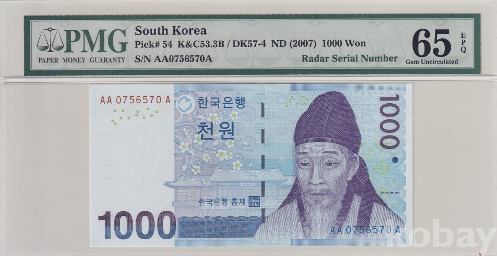 -희귀- 현행권 3차 천원 초판 레이더 AAA 075 6 570 - PMG 65 EPQ 그레이딩 인증 지폐