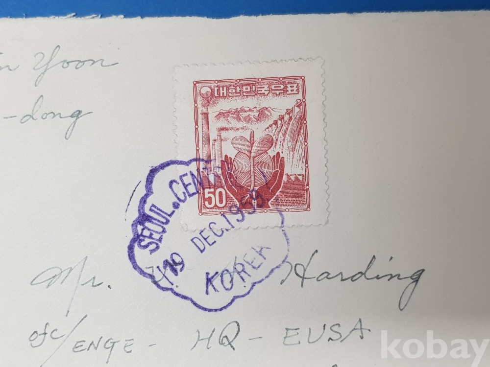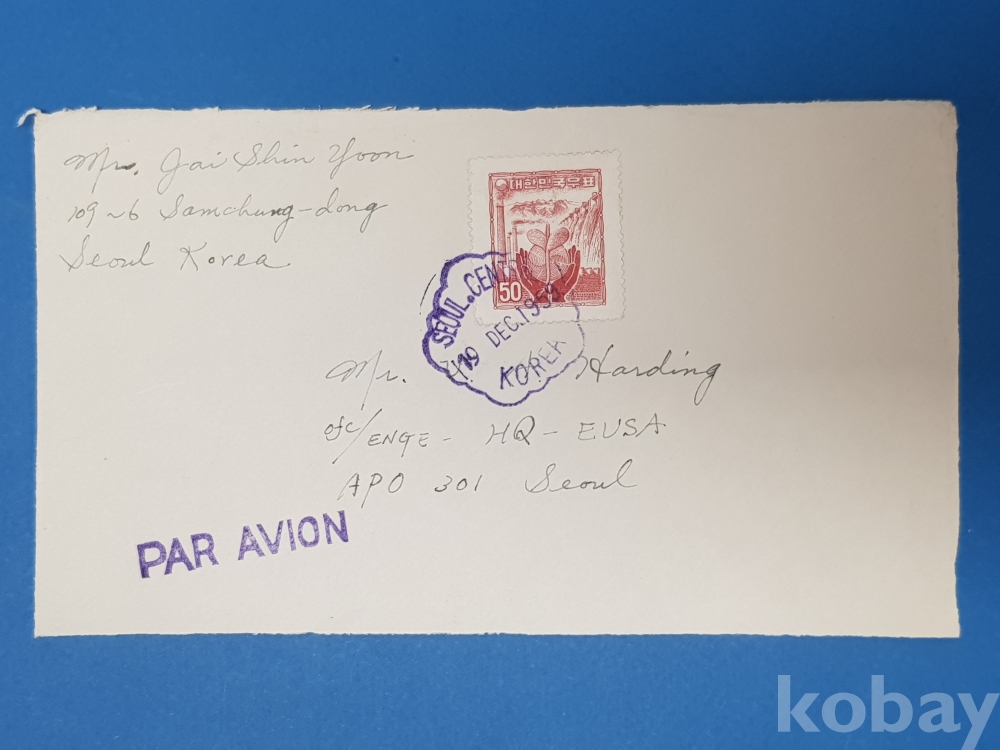 **** [엔타컷트] 산업도안보통 50환 단첩 APO 301 SEOUL 실체/서울중앙,19.DEC.1959 무궁화 외체인/PAR AVION 고무인/봉투 앞면만 있음