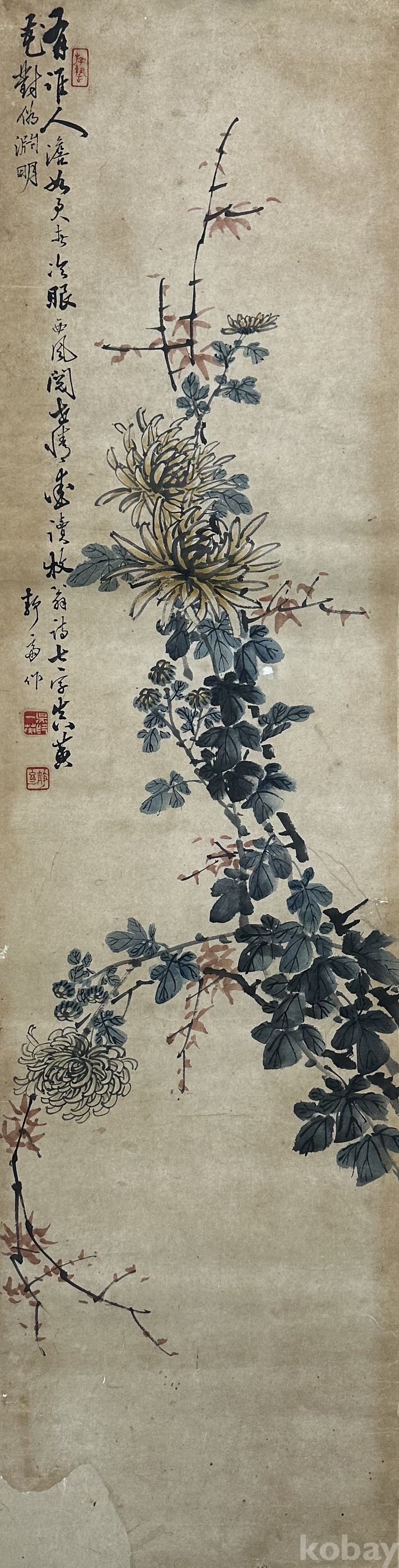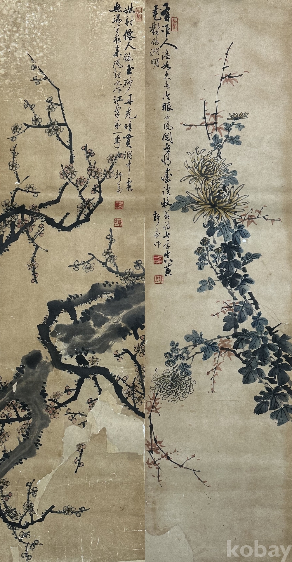 매화와 국화를 각각 한 폭씩 그린 2점 세트의 문인화입니다. 왼쪽에는 고결한 매화 가지가 힘 있게 퍼져 있으며, 먹선의 농담과 붓 터치가 생동감 있게 표현되었습니다. 오른쪽에는 국화가 은은한 채색으로 피어 있어 담백하면서도 기품 있는 분위기를 자아냅니다. 두 작품 모두 시문이 함께 구성되어 있어 문인화 특유의 사유적 깊이가 느껴지며, 세월의 흔적이 남은 종이 질감이 오히려 작품의 고풍스러움을 더합니다. 하단 일부에 약간의 훼손이 있으나 감상에는 큰 지장이 없습니다.