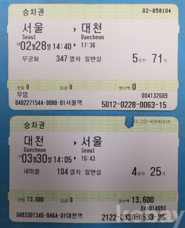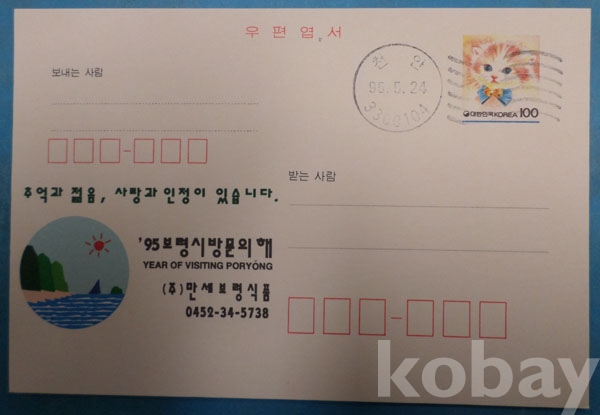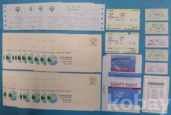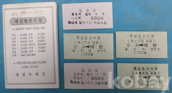 **** 보령관련 자료 일괄 [열차승차권,대천 홍보용 담배포갑지,대천우체국 체신업무수첩 ‘95보령시방문의해 광고엽서]