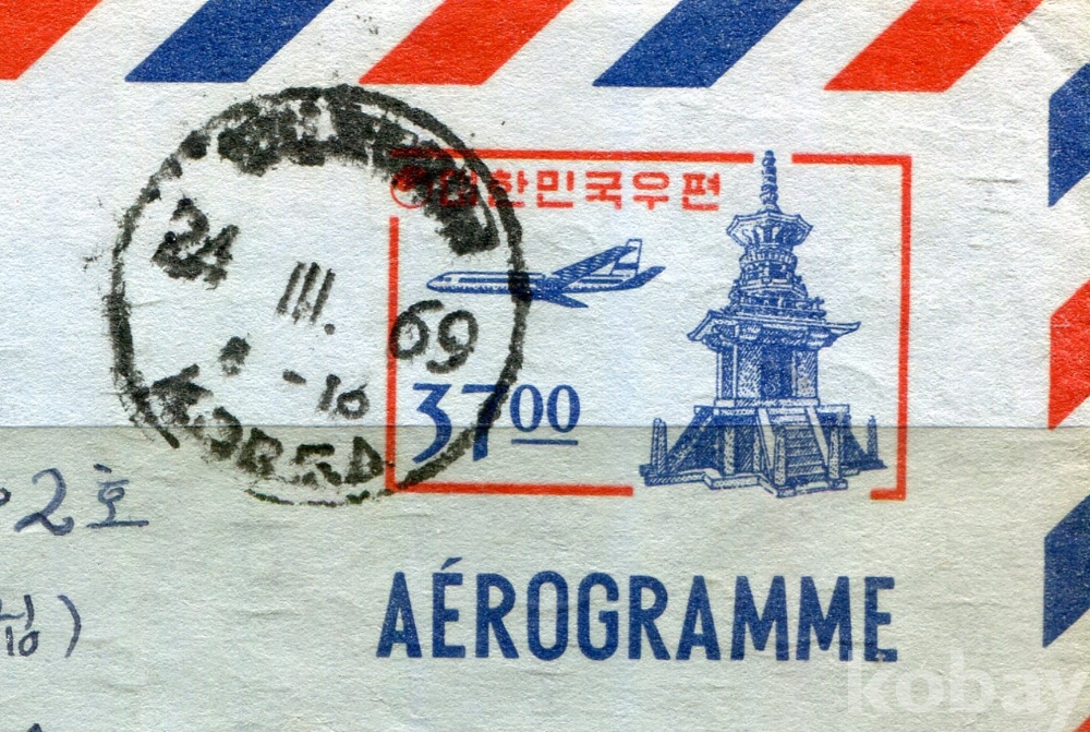 - [항공서간] 1969년 37원 다보탑 미국행 실체 (24. III. 69 소인) : 이미지 참조하세요