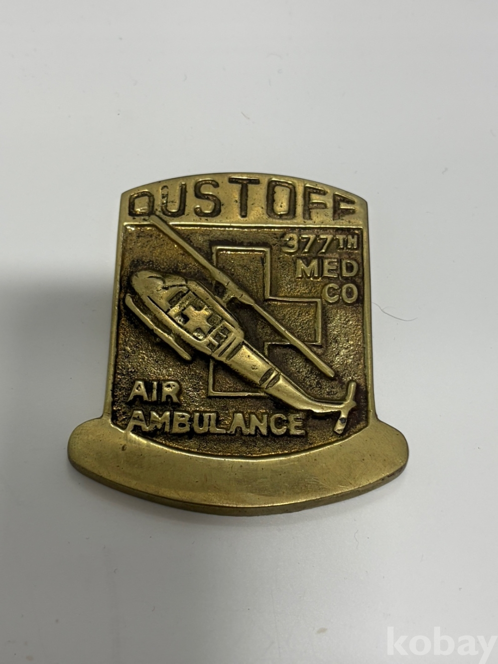 Dustoff" 및 "377th Med Co Air Ambulance" 문구가 새겨진 황동색 군사 기념 배지입니다