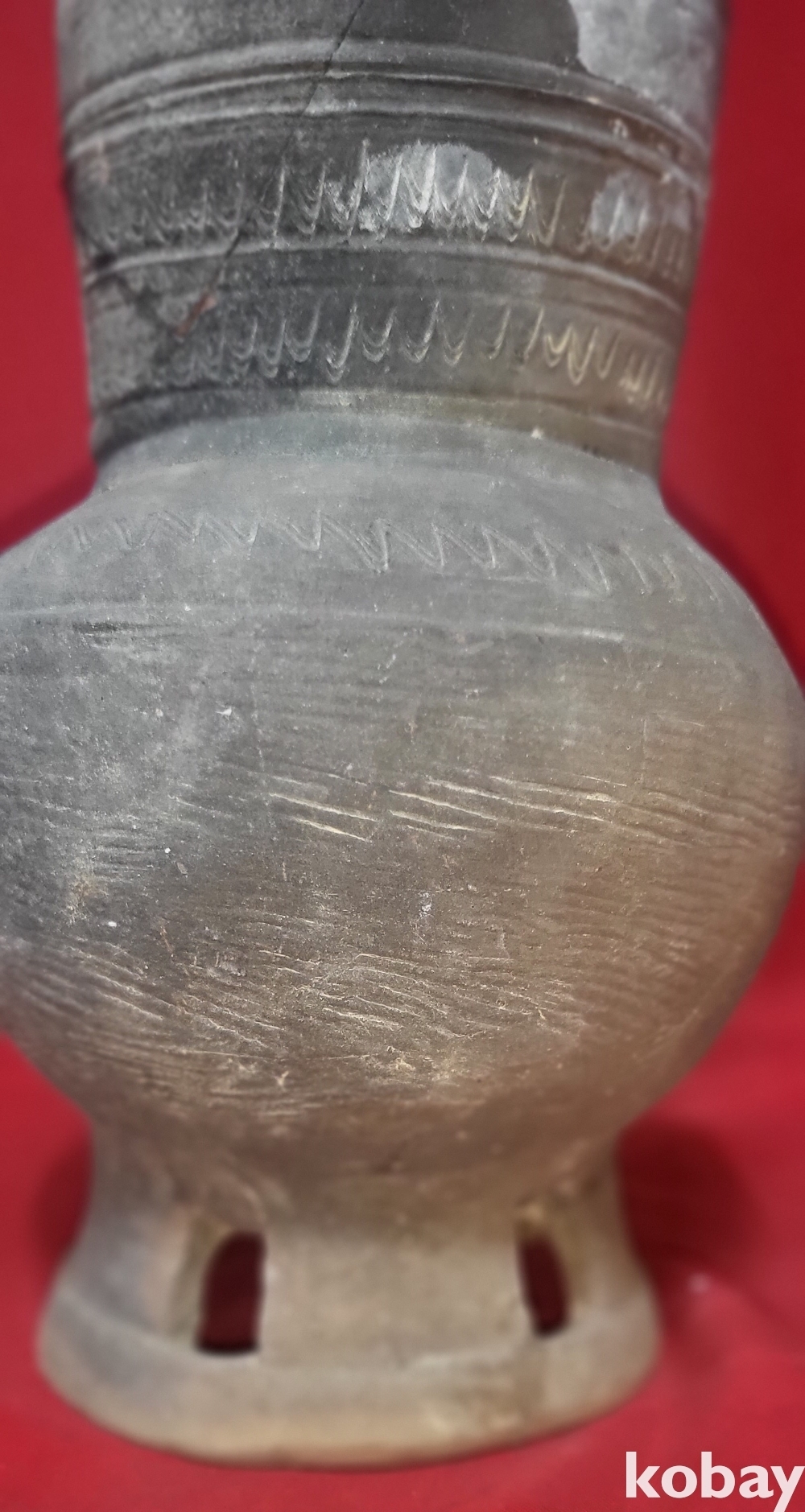 촘촘한 파상무늬 띠가 목부분 2군데 몸통부분 1군데 도자기 하단부 전체에 도안이 되어있습니다