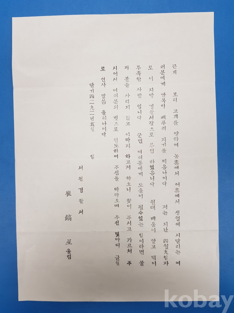 **** 경찰자료*1959년 서천경찰서장 부임인사장(서한문)