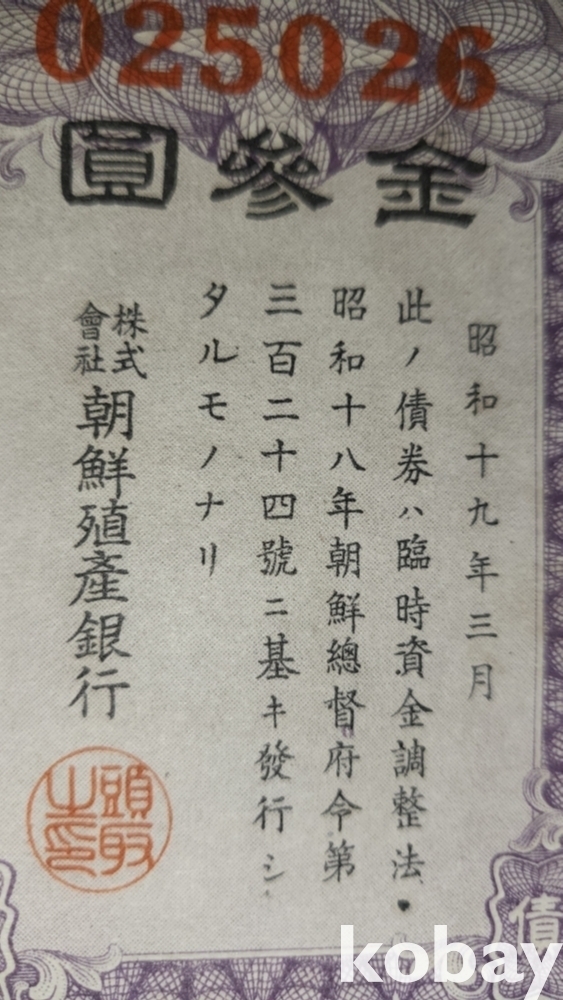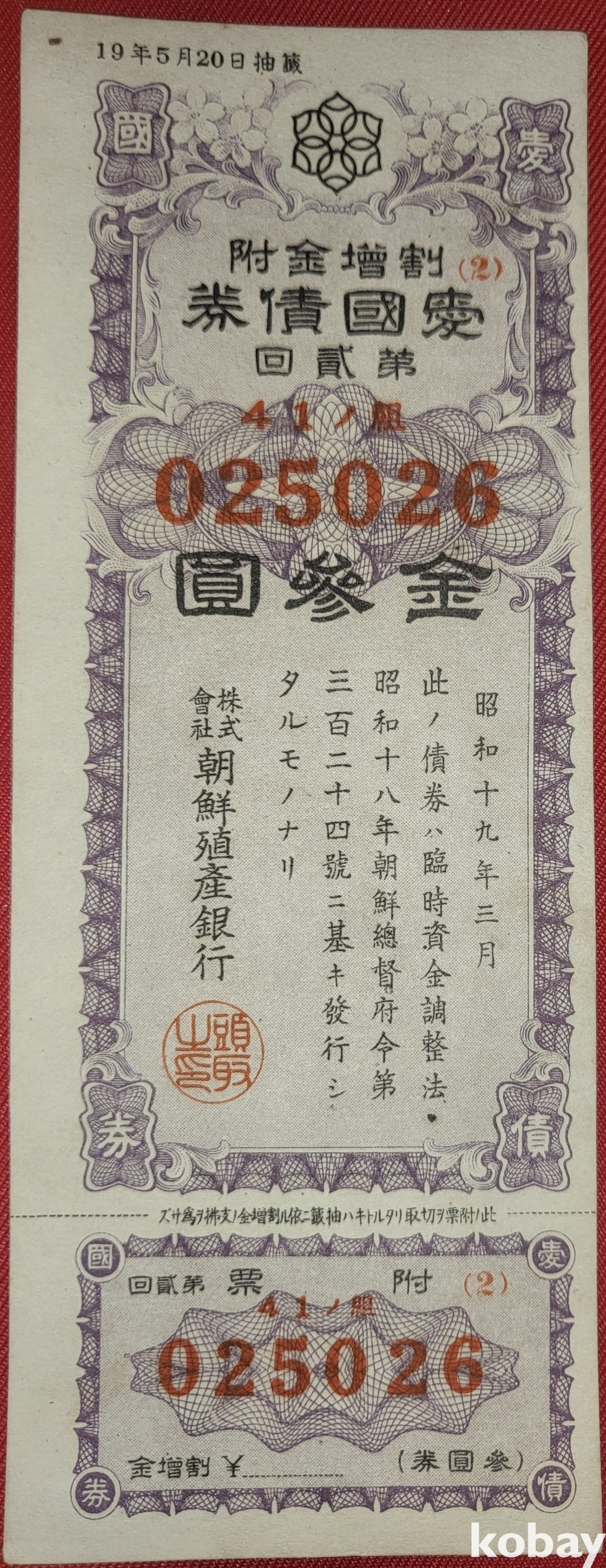 주식회사 조선 직산은행 소하19년(1943년) 발행된 할증금부(割增金附)입니다,
