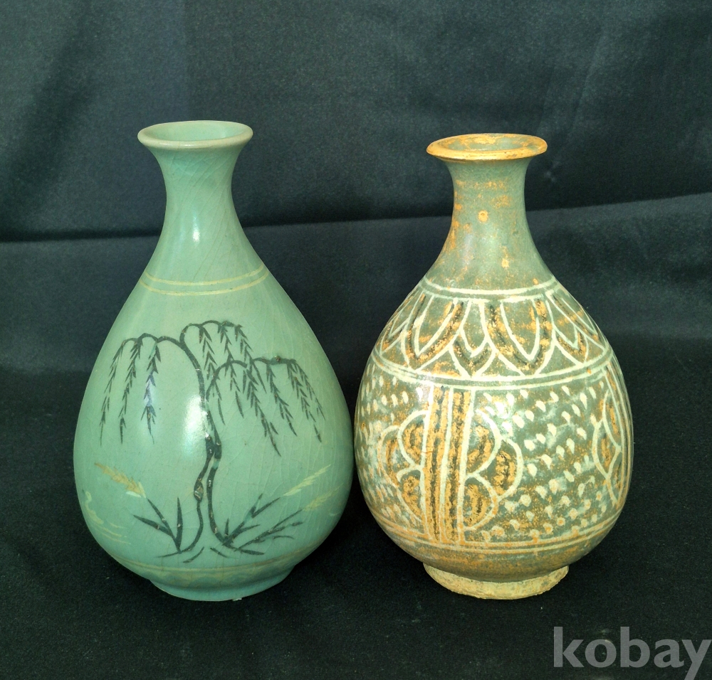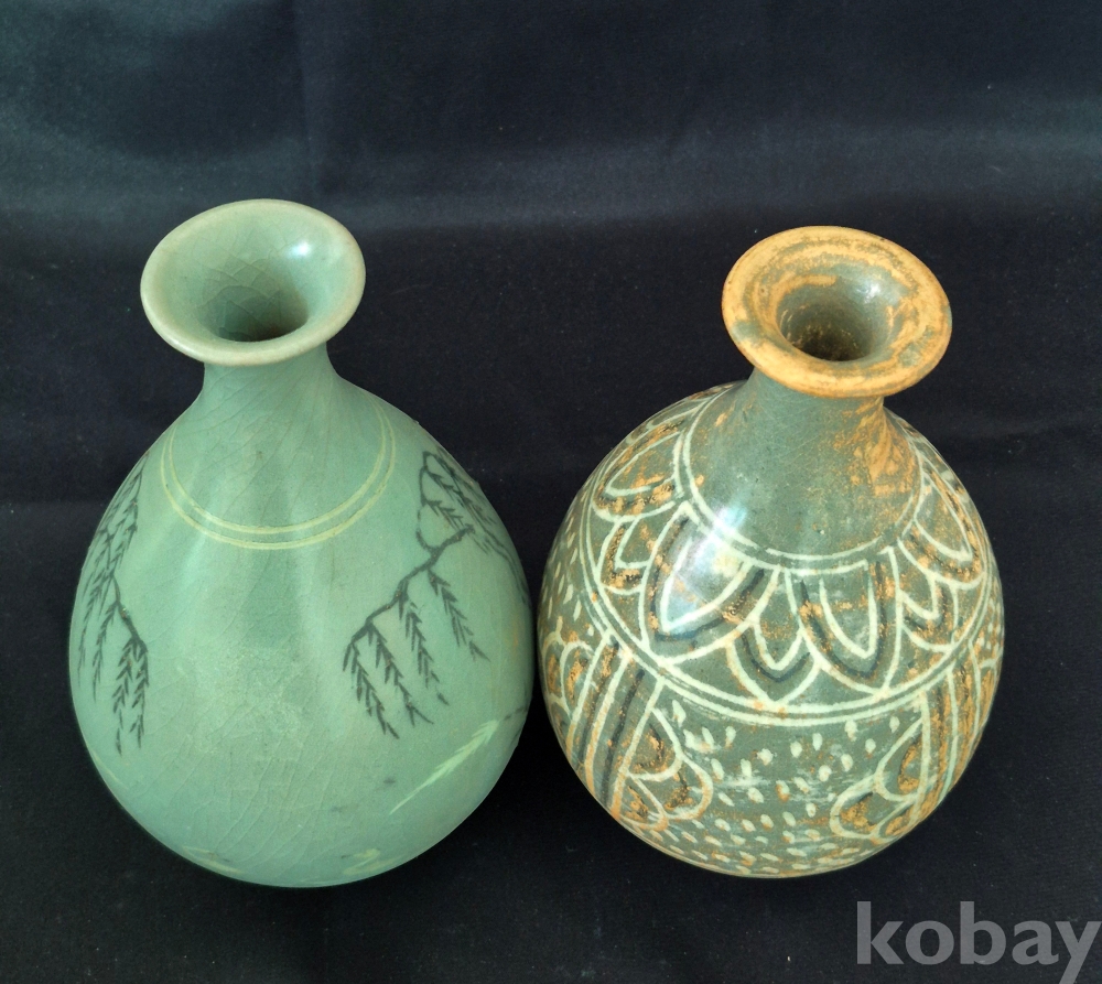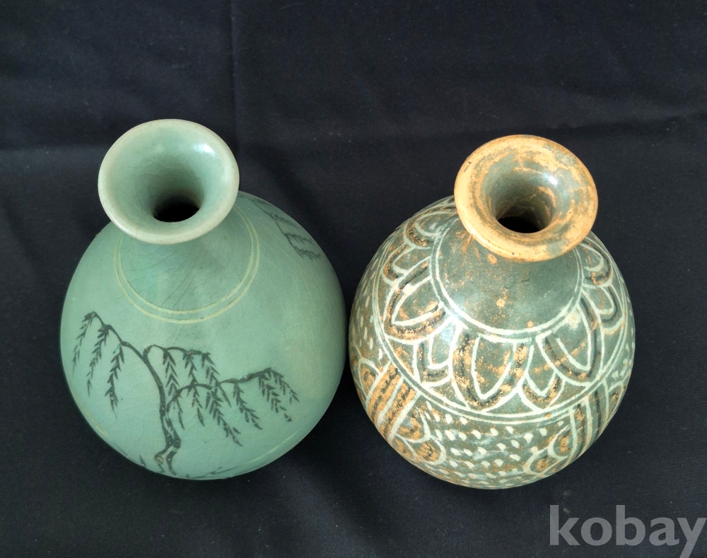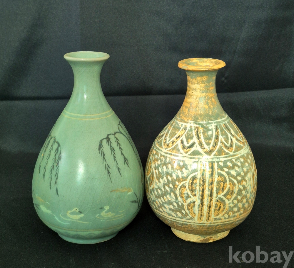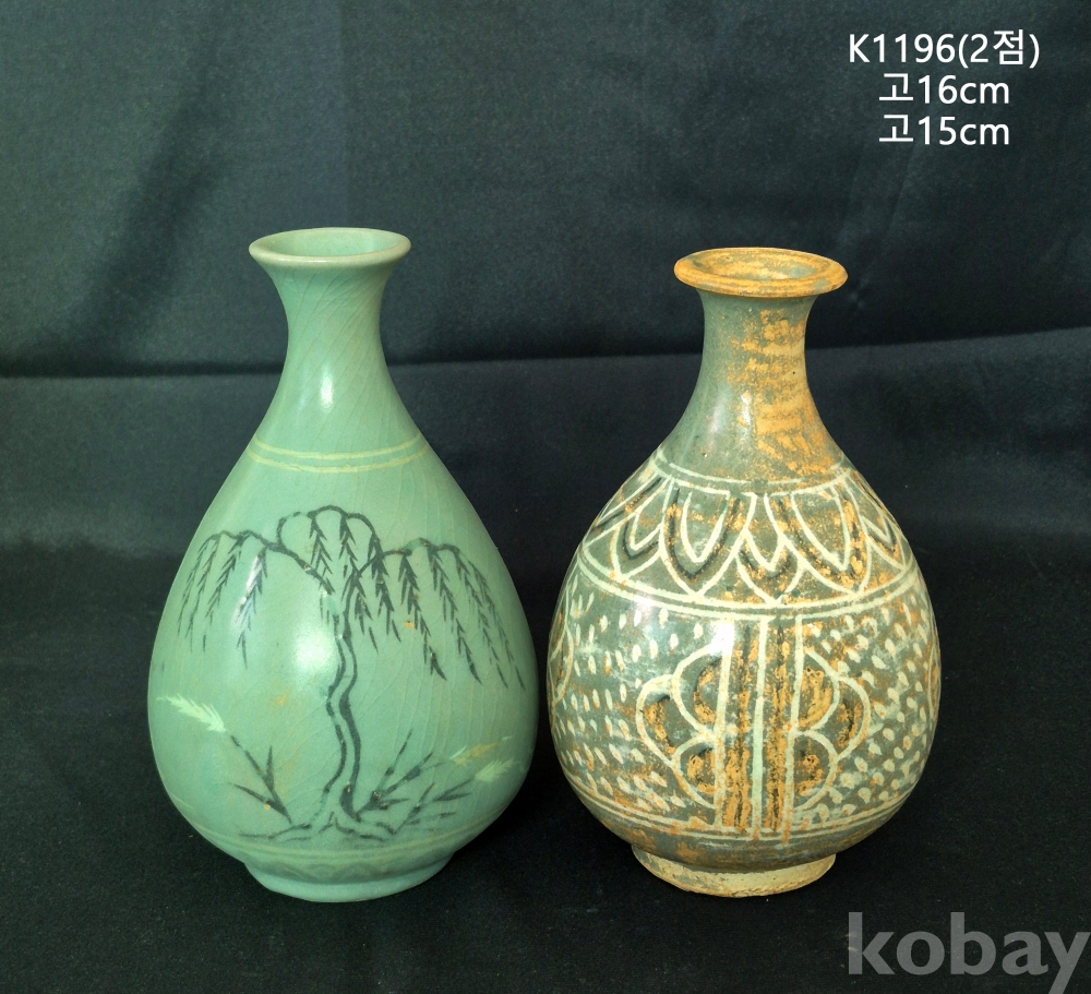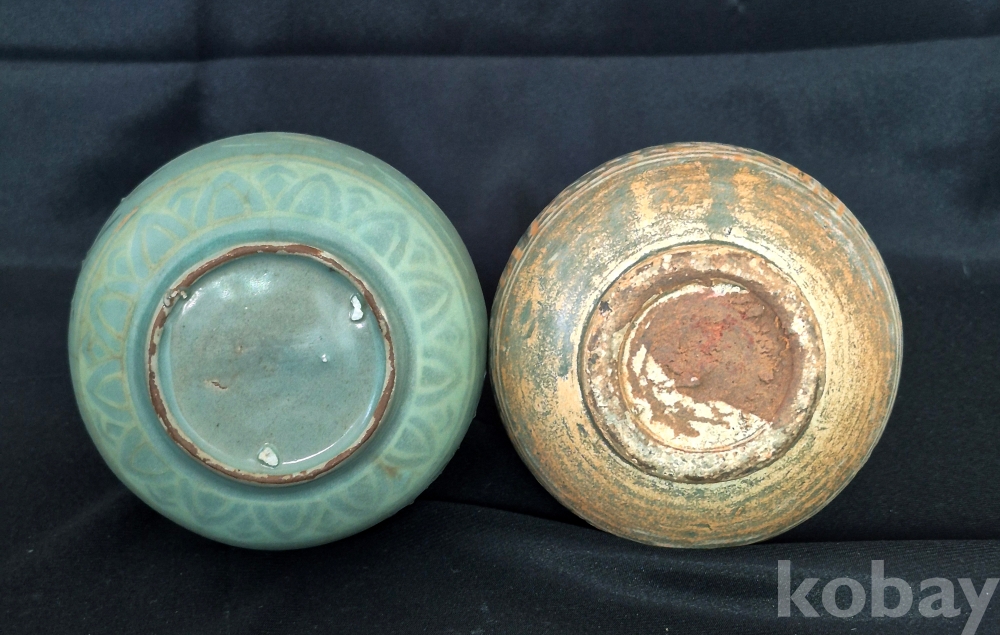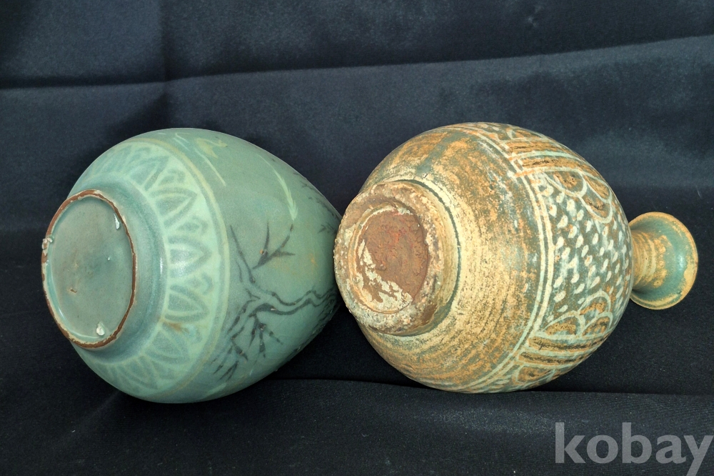 좀 큰 것은 고려의 상감청자이고, 한점은 조선의 분청사기인데 기형이 같고 크기도 같아 짝이 될수 있을 것