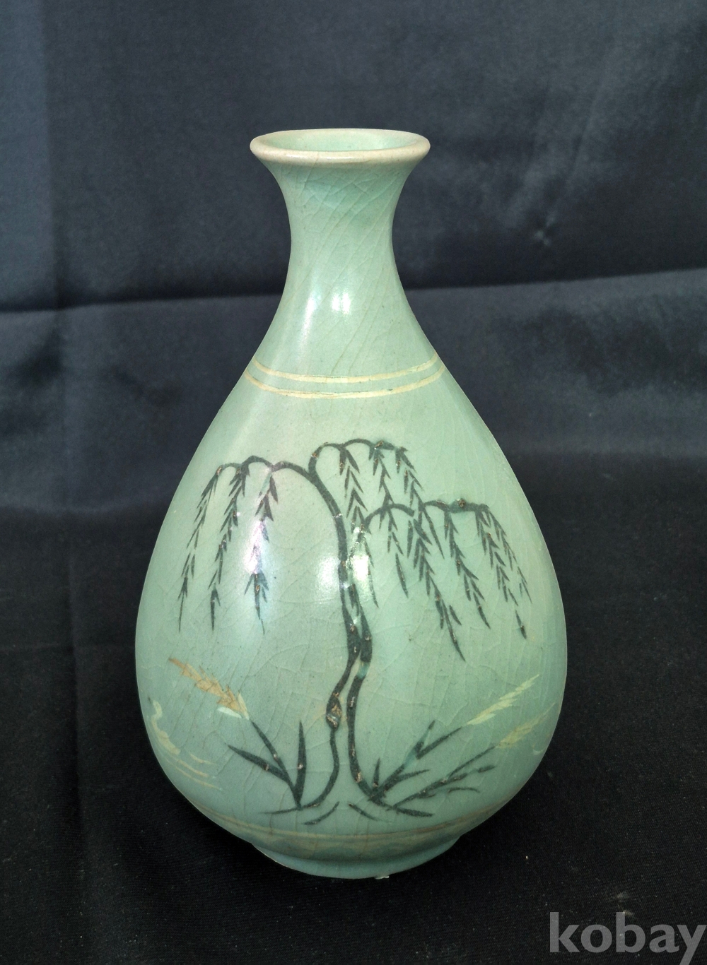 상감청자는 늘어진 버드나무 연못에서 오리 한쌍이 노니는 한가로운 풍경을