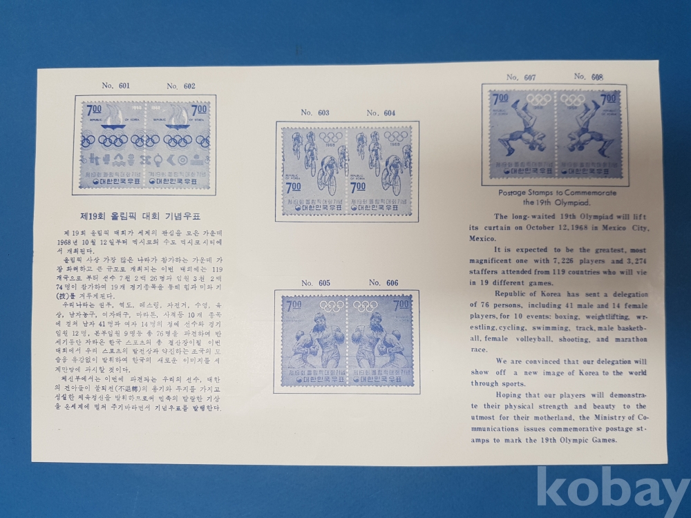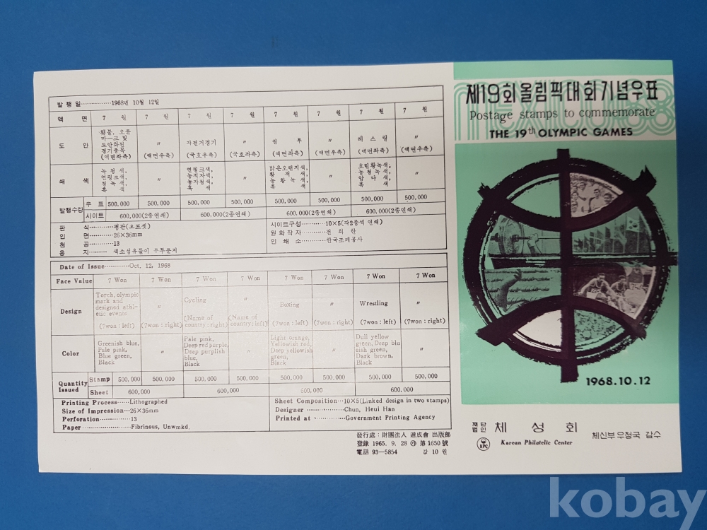 **** 제19회 올림픽 대회 기념우표/1968.10.12/대한민국 체신부