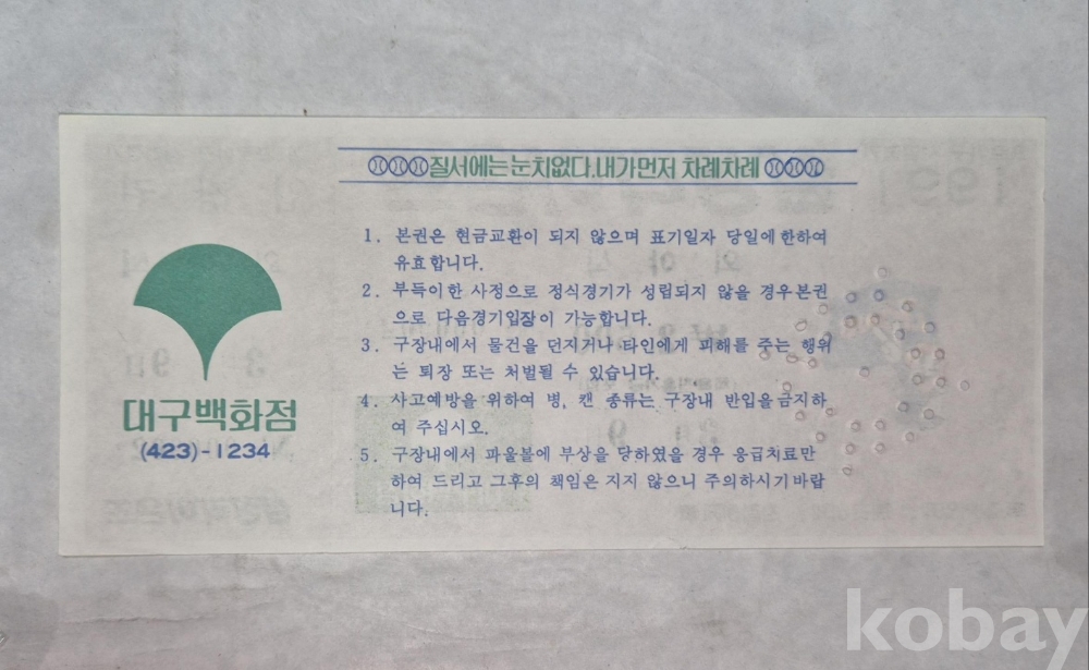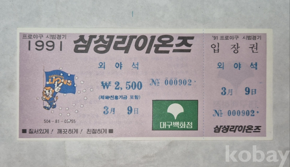 1991년 한국 프로야구 '삼성라이온즈' 시범경기 외야석 입장권 1매입니다.