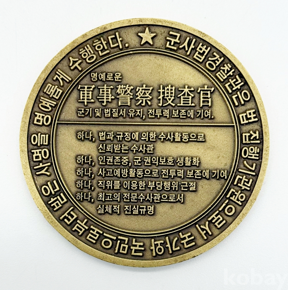 상품 설명 | 대한민국 육군 군사경찰에게 수여한 기념 메달 1점이다. 메달의 뒷면에는 군사경찰 행동강령이 쓰여 있다. | ||