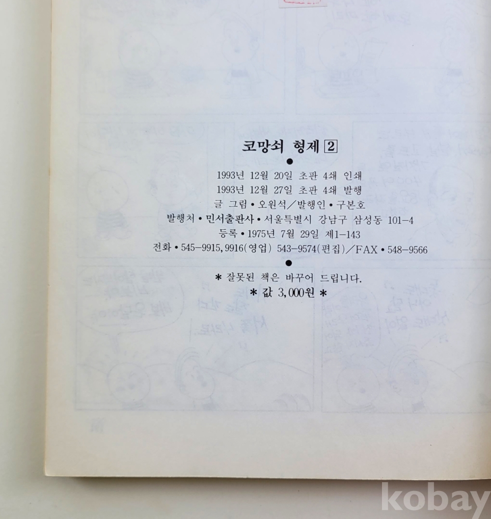 물 품 명 | [명량만화] 오원석 / 코망쇠 형제(2) / 소년동아일보 인기연재만화 / 1993년 / 민서출판사 |