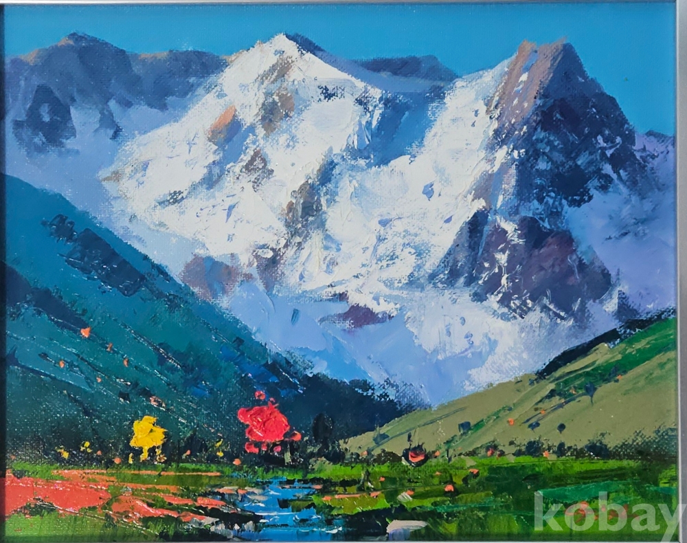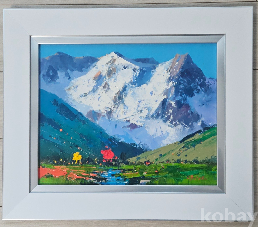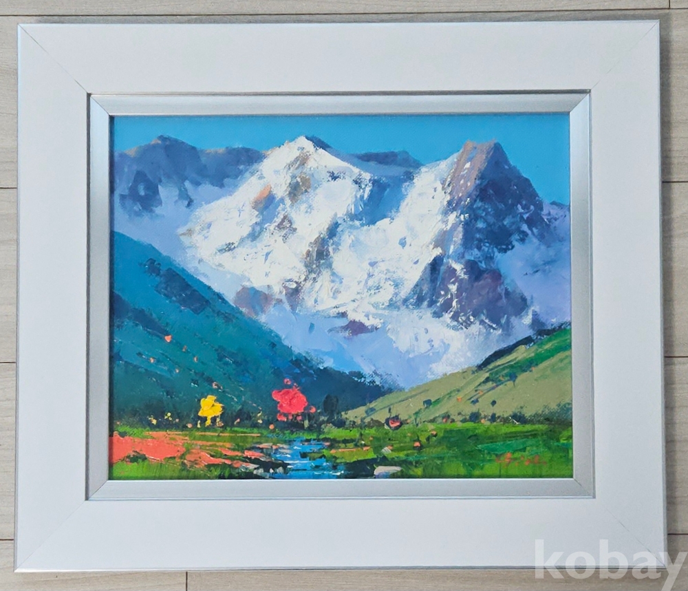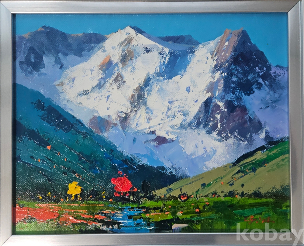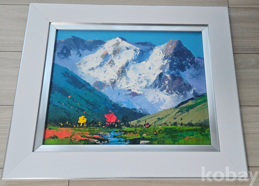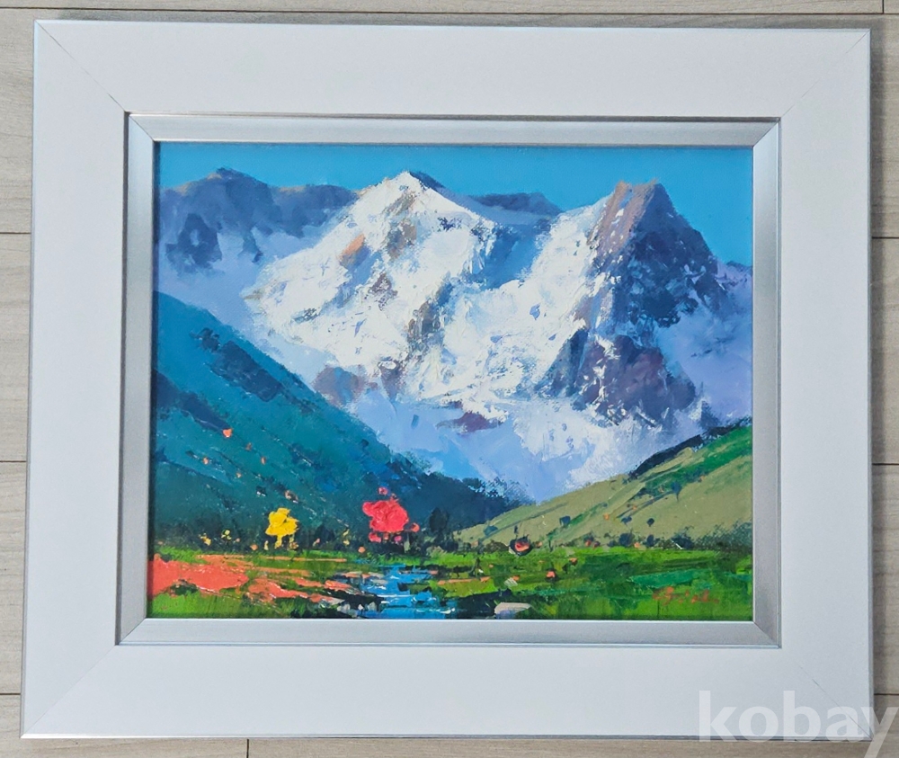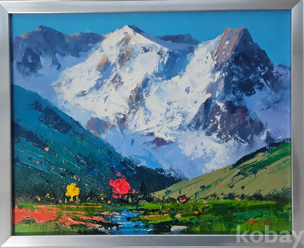 눈덮인 산봉우리를 배경으로 강렬한 색채의 꽃과 어우러진 풍경을 표현