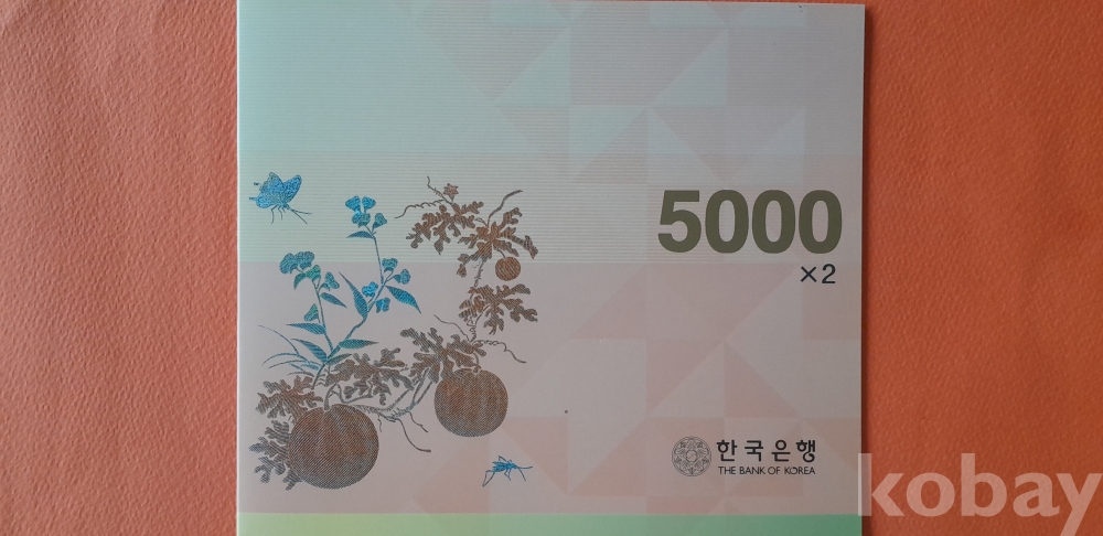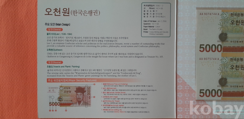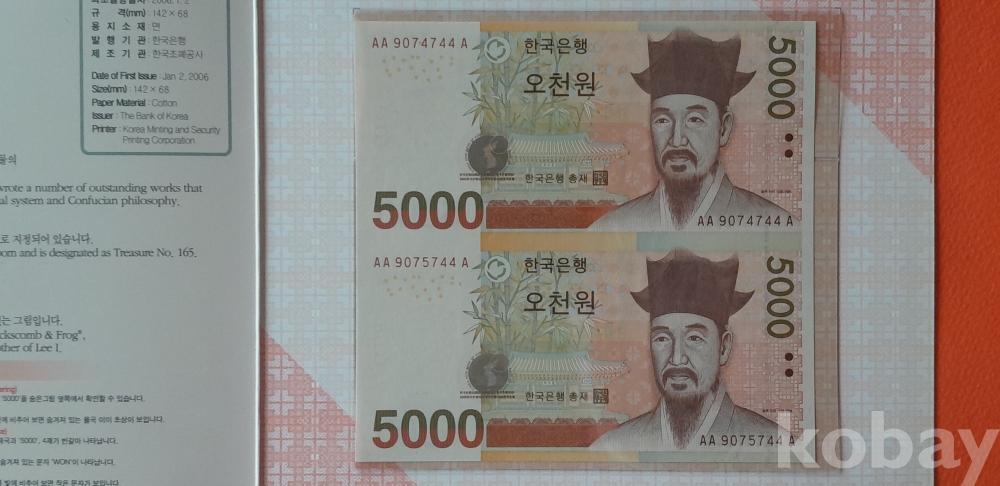 한국은행 마 5000원권 2면/최초 발행 2006. 1. 2(AA 9074744 A, AA 9075744 A) 연결형은행권 입니다.