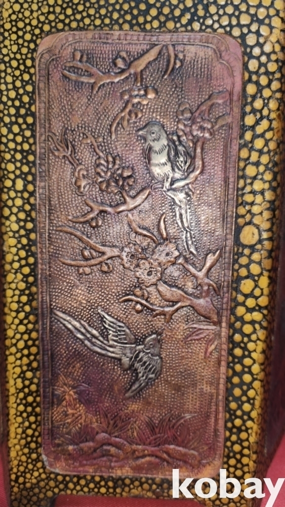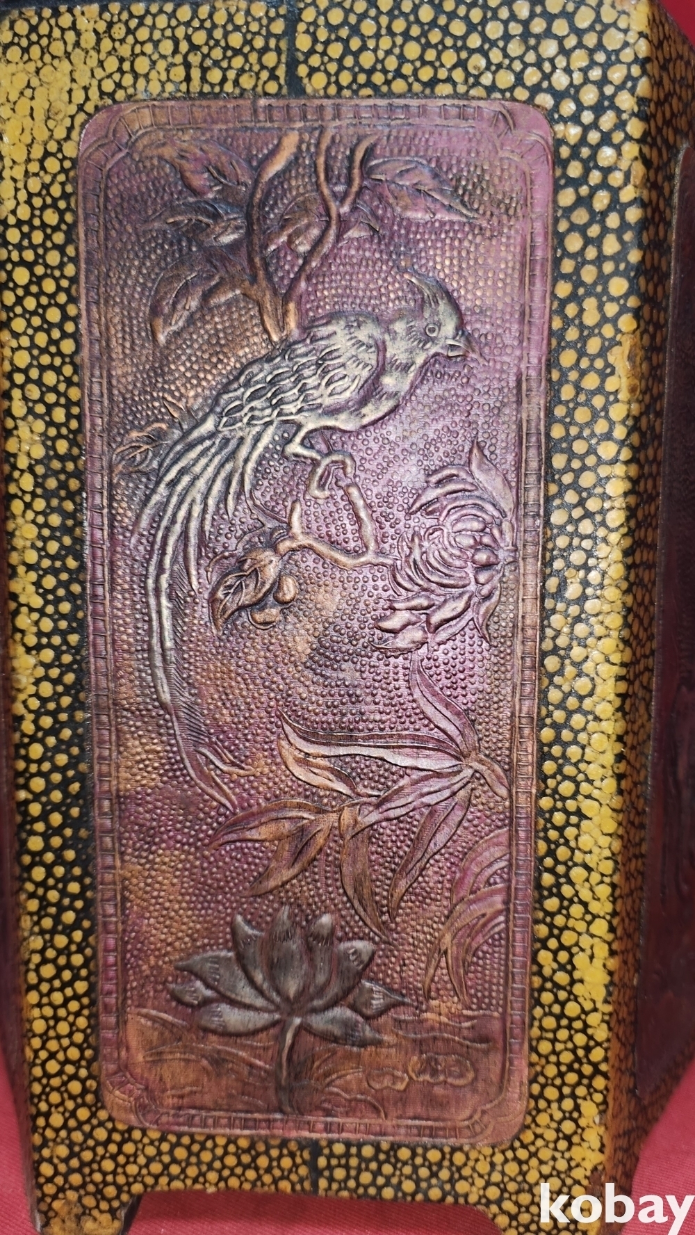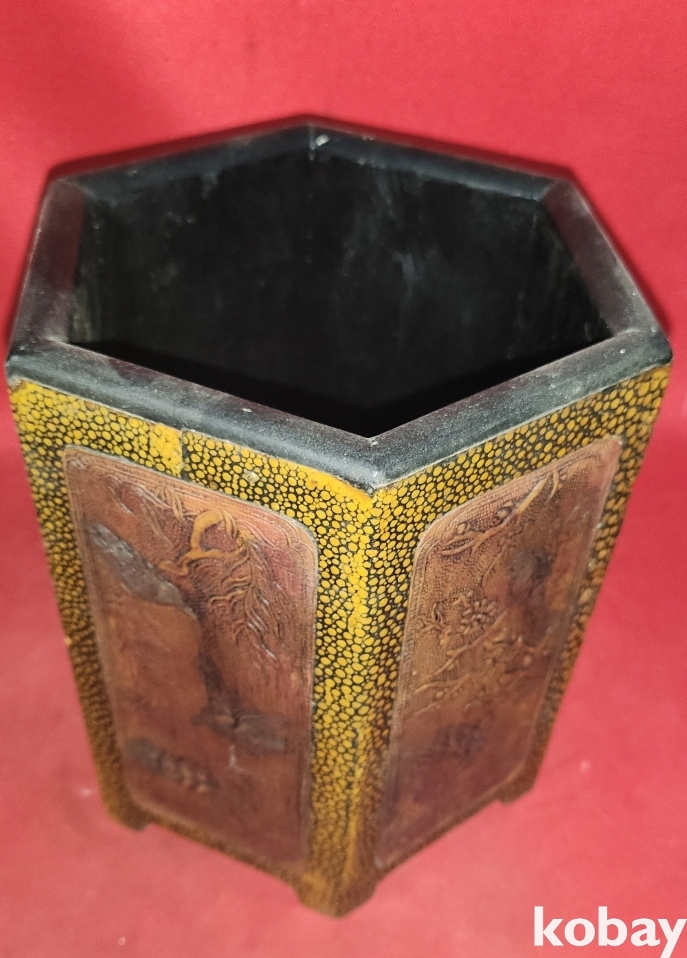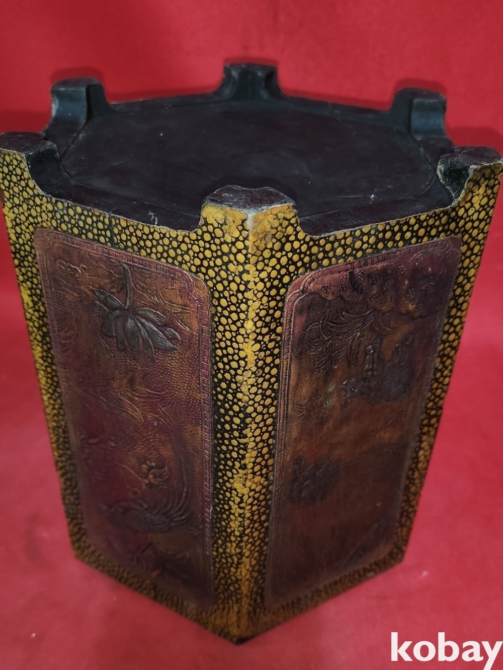 무에 동판 (銅板)과 어피 (魚皮 )로 장식된 6각 필통입니다,