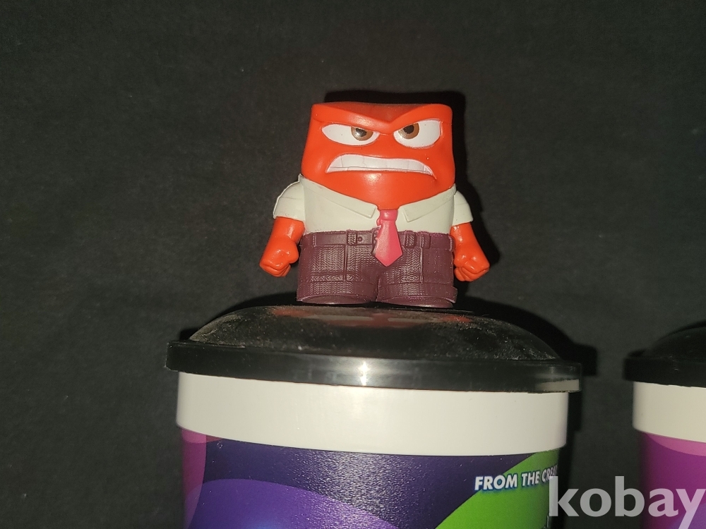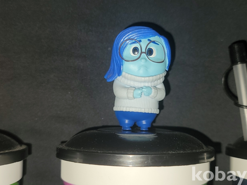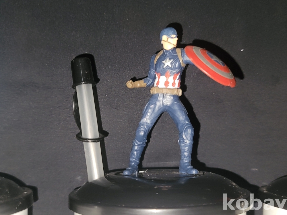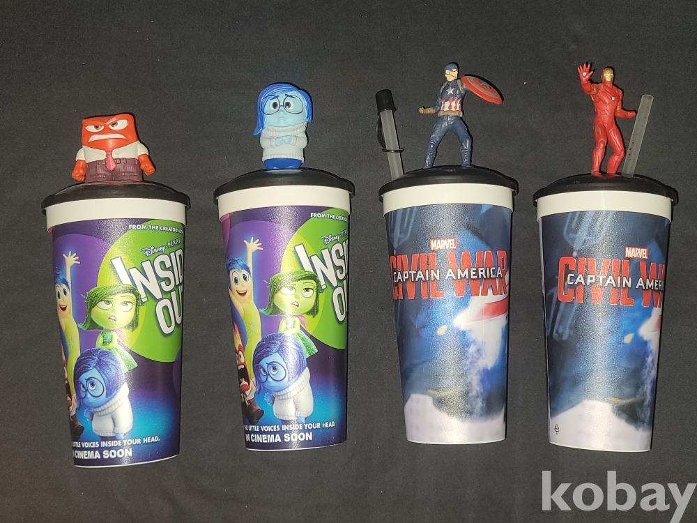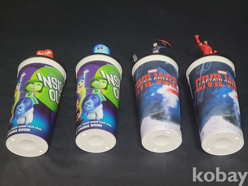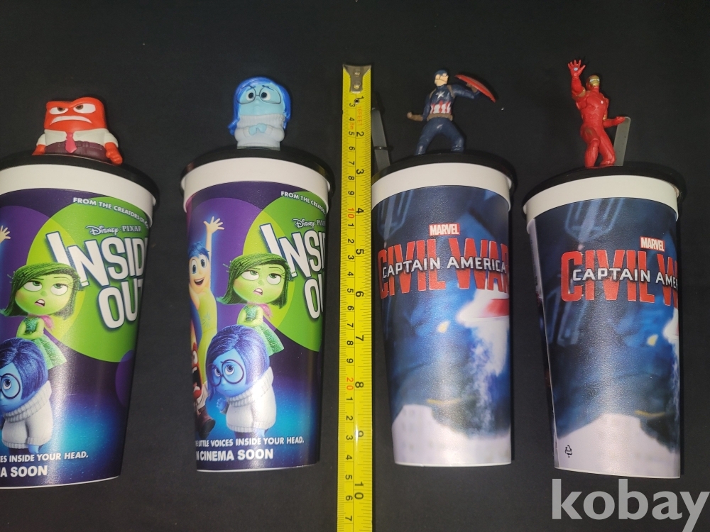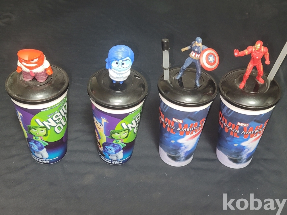 빈티지 영화관에서 판매되던 인사이드 아웃, 마블 캡틴 아메리카 피규어가 달린 음료 컵 굿즈입니다.