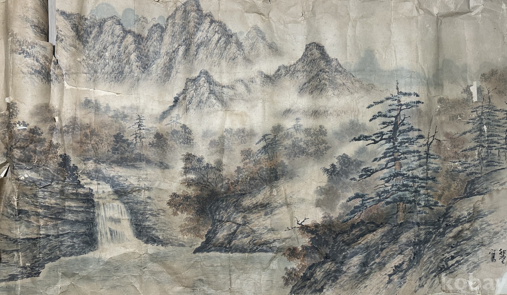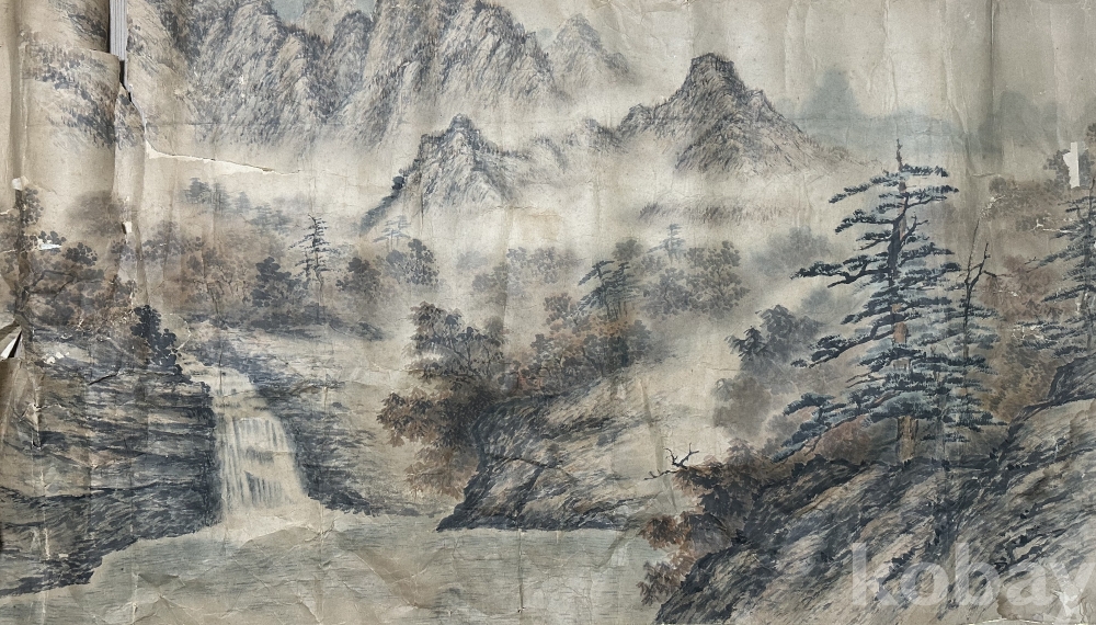 본 작품은 안개 낀 산중 풍경을 그린 전통 산수화로, 깊은 계곡 사이로 폭포가 흘러내리고 층층이 겹친 산맥이 아득히 이어지는 구도를 지녔습니다. 수묵의 번짐과 담채의 색감이 조화를 이루며, 안개가 서린 듯한 묘사로 깊이감과 공간감을 강조했습니다. 화면 우측의 소나무와 왼편의 폭포가 균형을 이루며, 전체적으로 조선 후기 혹은 근대기의 문인화풍에 가깝습니다. 세월의 흔적에 따른 접힘, 얼룩, 일부 찢김 등 보관 상태는 양호하지 않으나, 원본의 회화적 분위기와 기운은 잘 남아 있습니다.