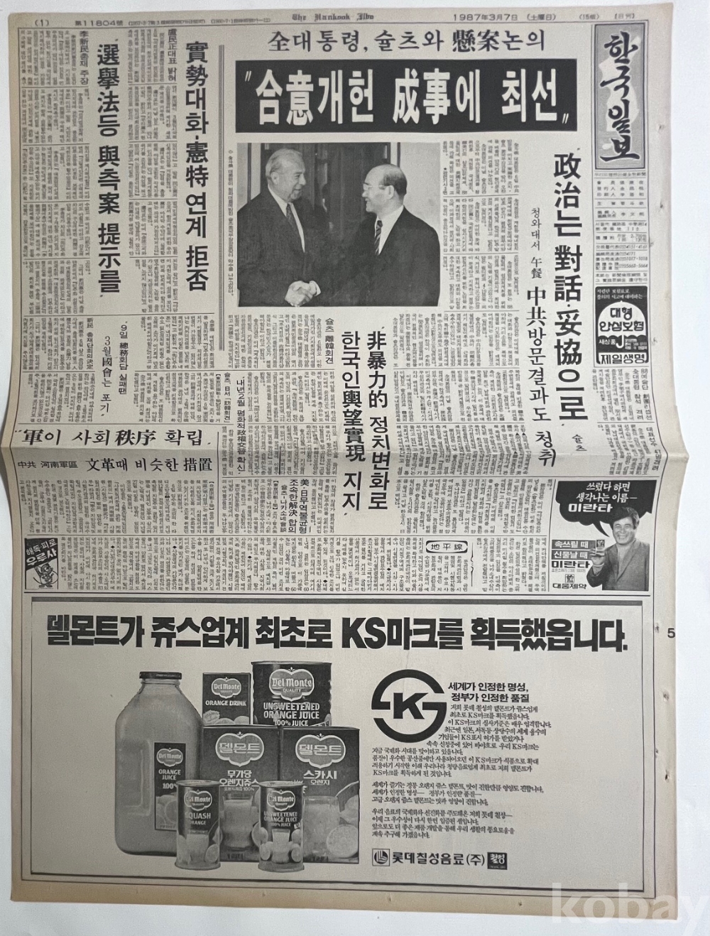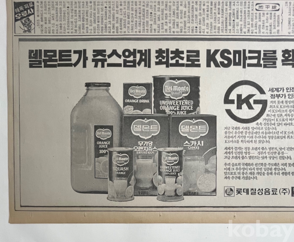 롯데 델몬트 광고가 실린 1987년 한국일보 낱장입니다.