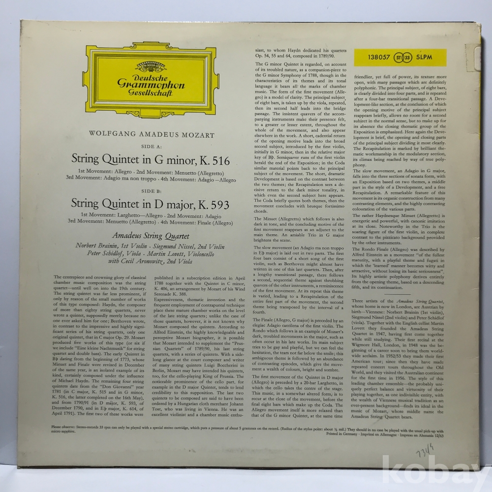 LP 36,550-18 Mozart String Quintets in G miner,K.516 . 수입 자켓 EX 알판 EX